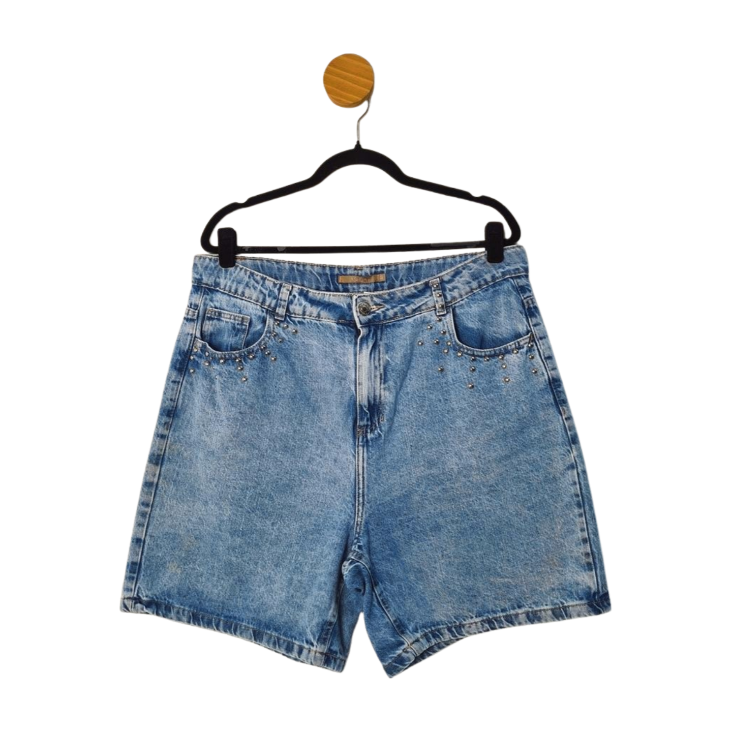 Bermuda jeans com spikes nos bolsos, cintura alta, 100% Algodão. Medidas: 96 cm cintura, 128 cm quadril, 48 cm comprimento, 34 cm gancho.