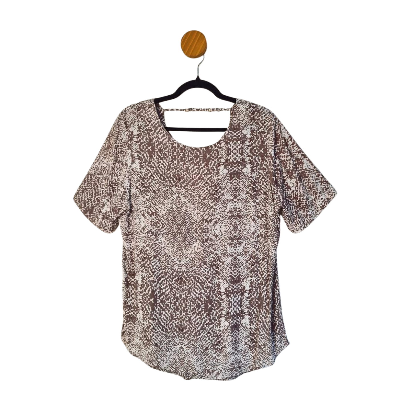 Blusa em crepe, gola canoa, decote profundo nas costas. 100% Viscose. Medidas: 112 cm busto, 110 cm cintura, 68/80 cm comprimento.
