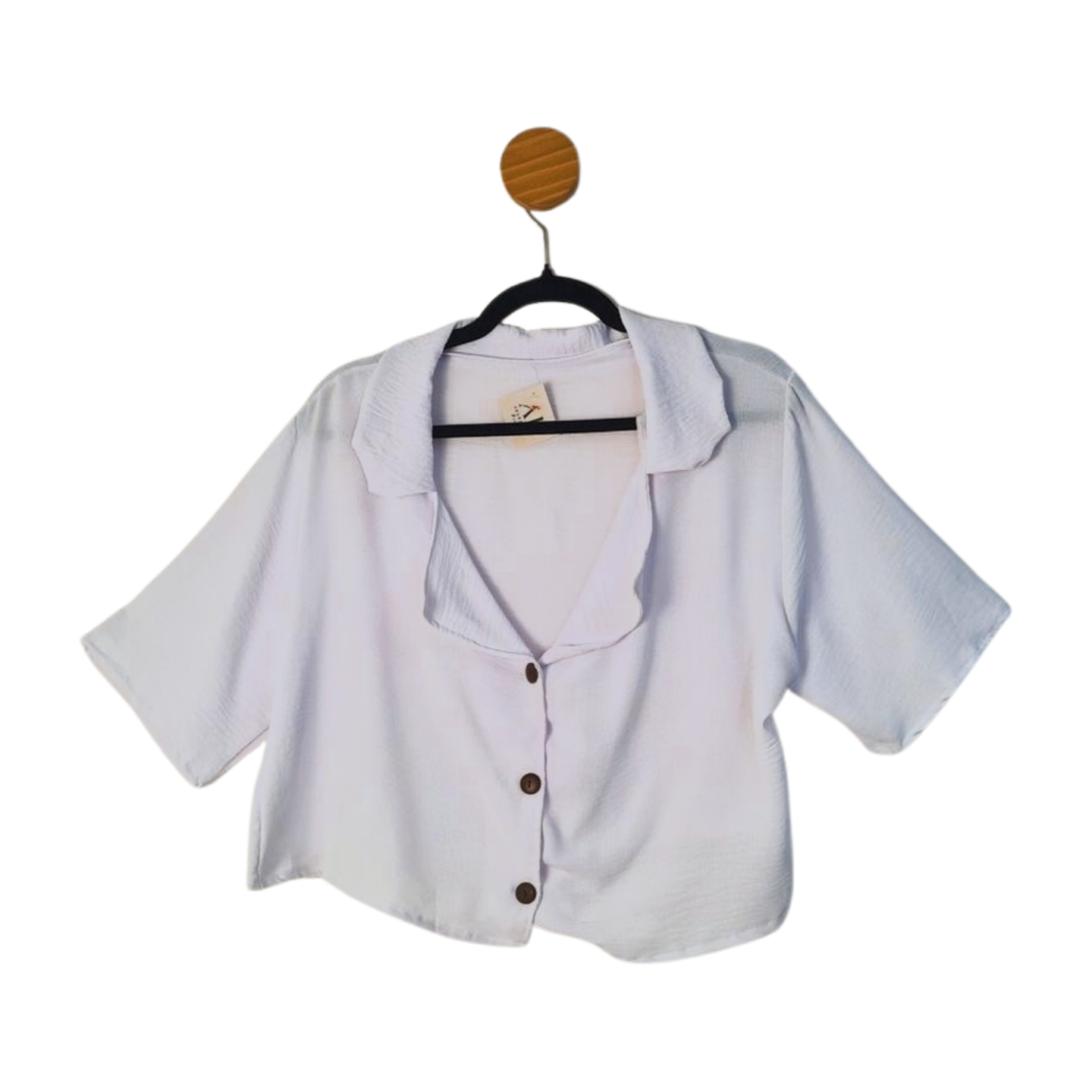 Blusa cropped em tecido leve e fluido, ampla com gola e fechamento em botão. 100% Poliéster. Medidas: 120 cm busto, 120 cm cintura, 44 cm comprimento.