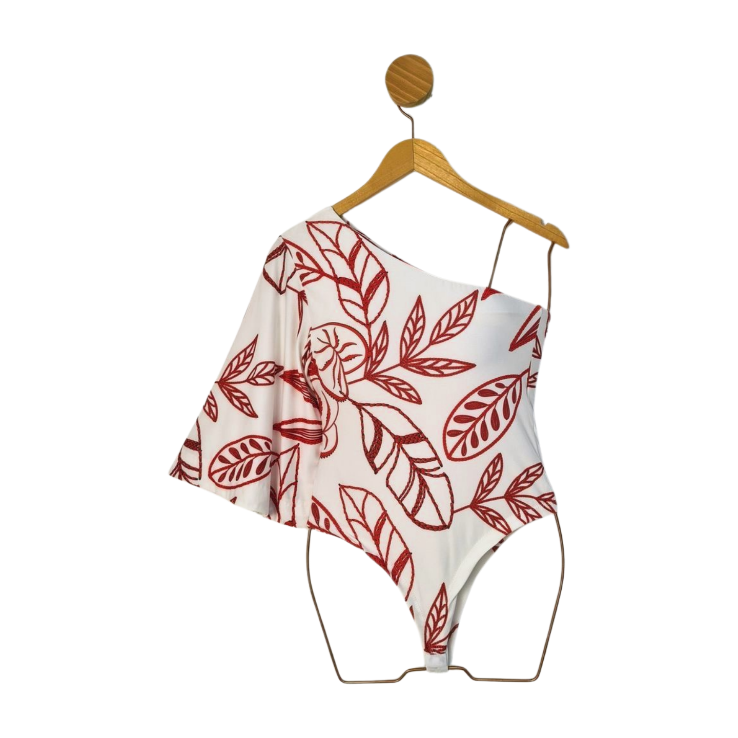 Body estampado em malha, um ombro só, com bojo e elástico no decote, 95% Poliamida e 5% Elastano. Medidas: 80 cm busto, 82 cm cintura, 66 cm comprimento.