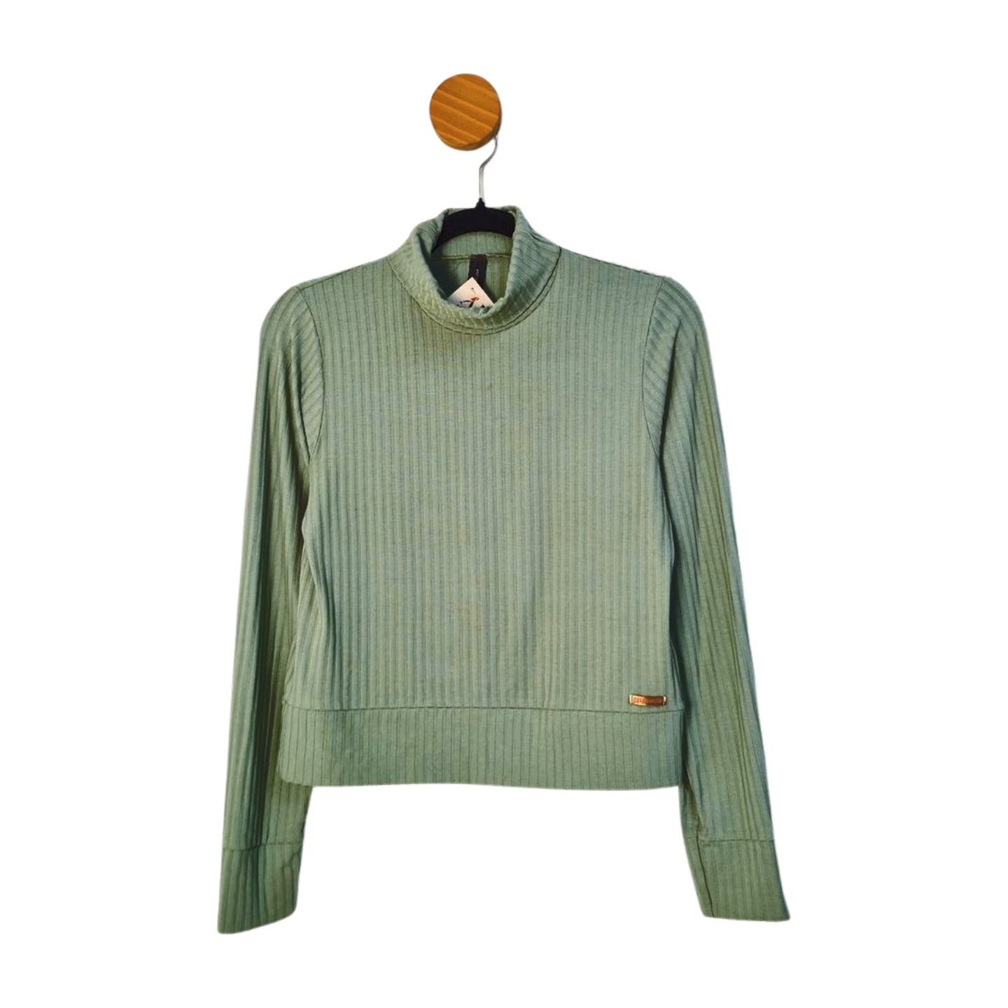 Blusa manga longa canelada, gola alta, 85% Viscose. Medidas: 98 cm busto, 94 cm cintura, 50 cm comprimento.