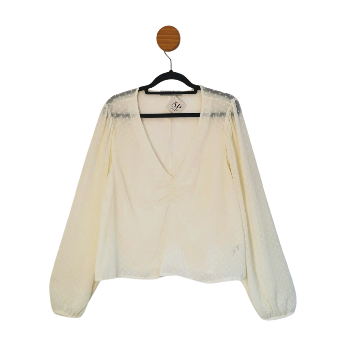 Blusa em crepe levemente transparente com textura poá, detalhe em elástico no decote e nos punhos, 100% Poliéster. Medidas: 108 cm busto, 108 cm cintura, 56 cm comprimento.