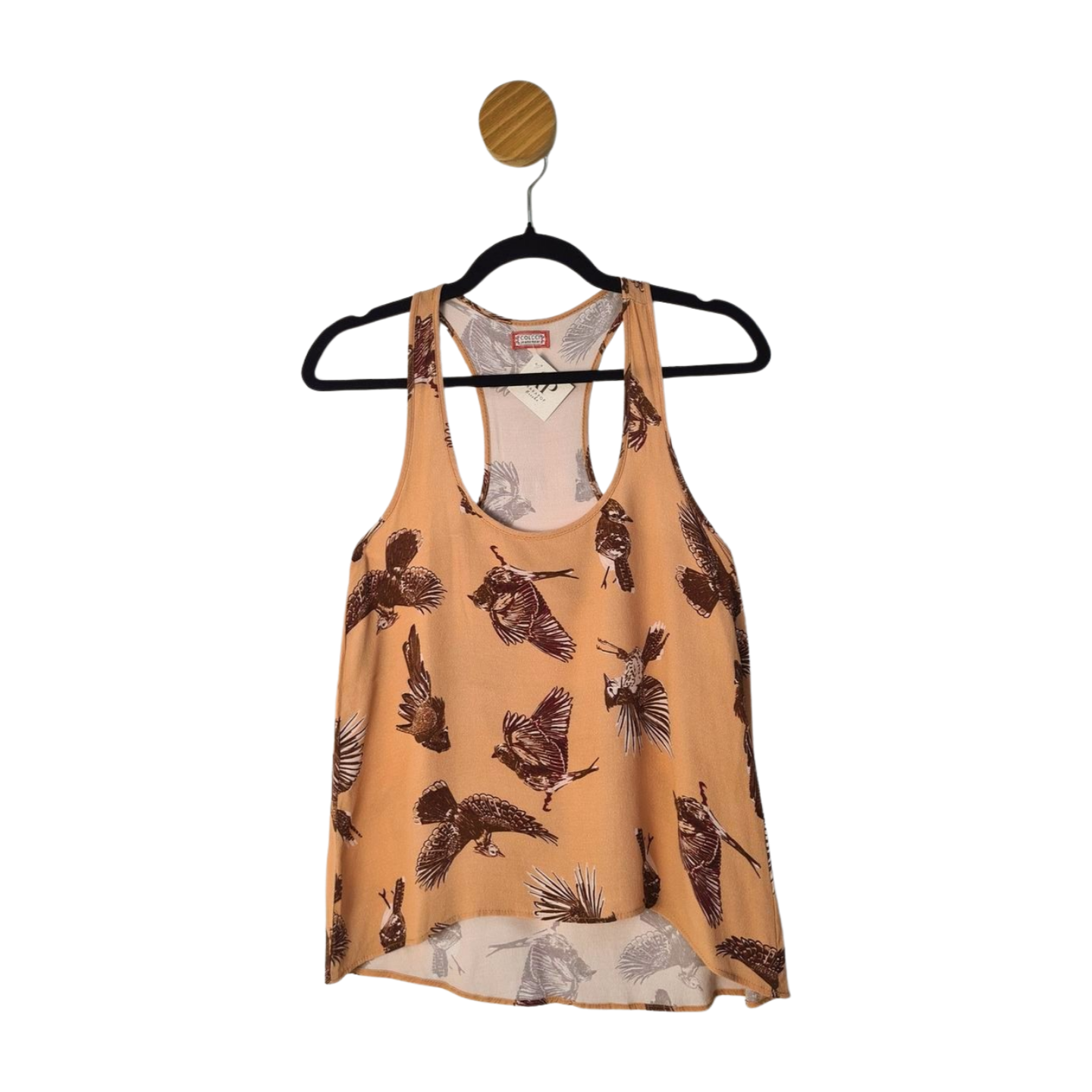 Blusa regata em crepe decote nadador, estampa pássaro. Medidas: 80 cm busto, 90 cm cintura, 69 cm comprimento.