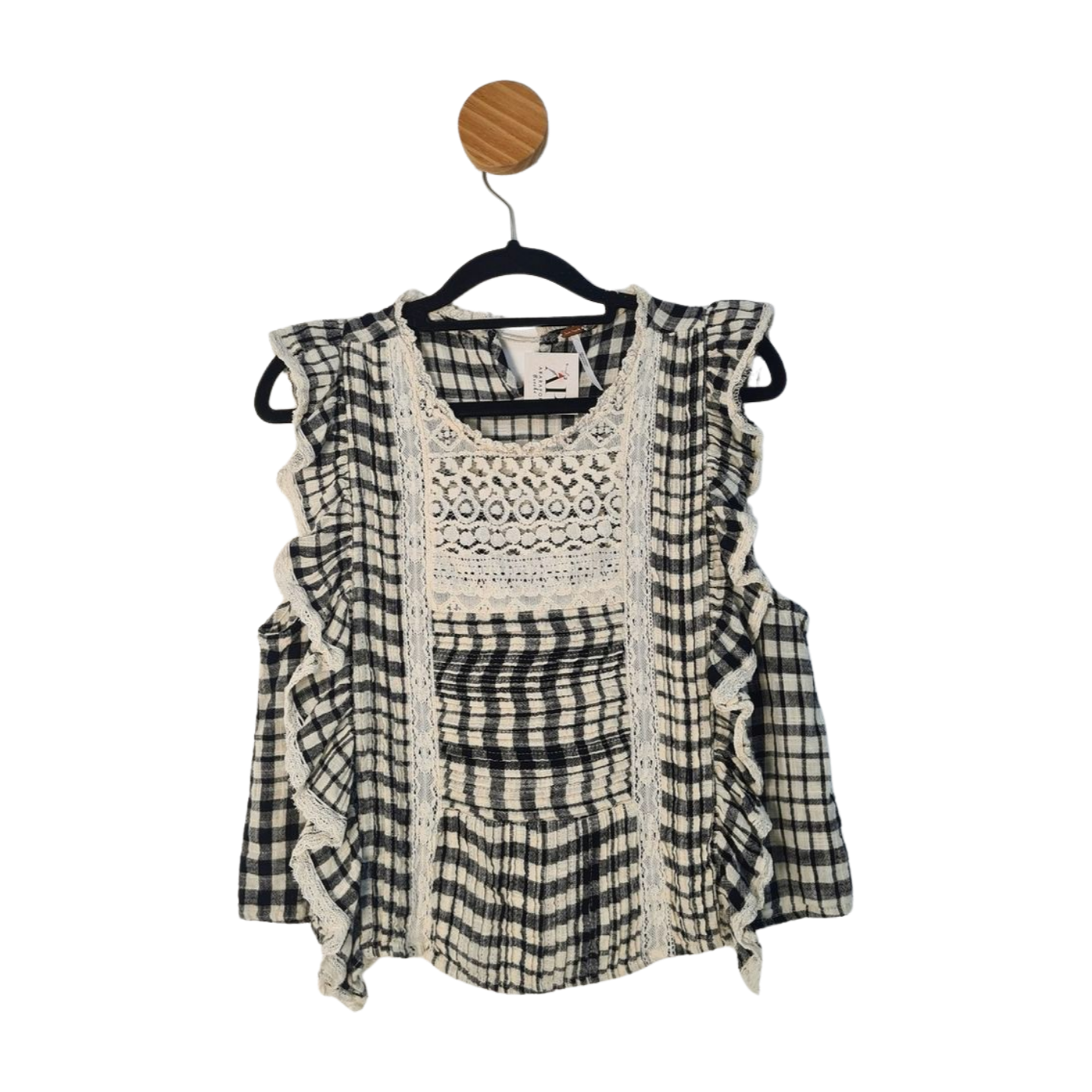 Blusa com detalhe de renda no busto, babado e drapeado, 100% Algodão. Medidas: 106 cm busto, 108 cm cintura, 48 cm comprimento.