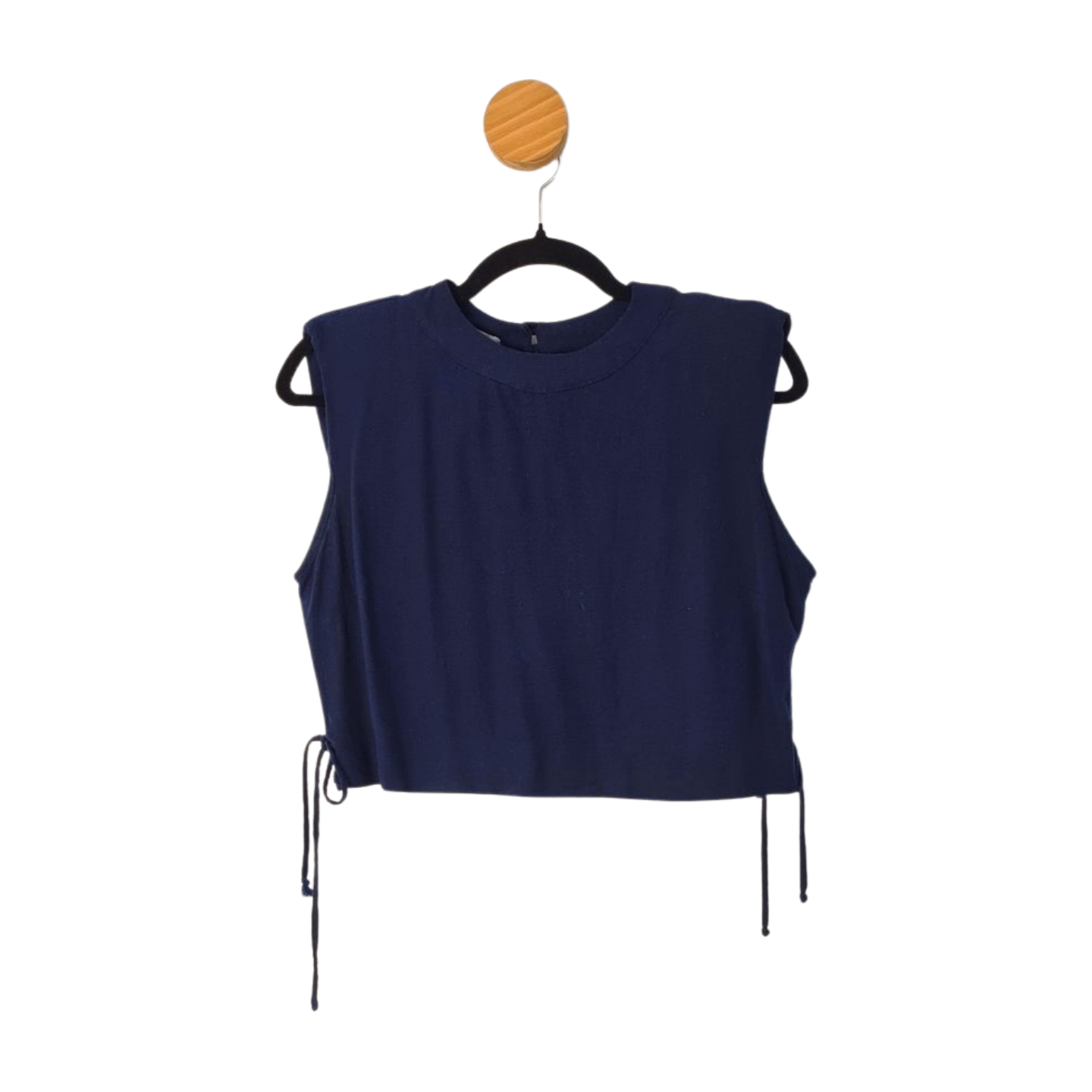 Blusa muscle tee com gola canoa e amarrações laterais, 70% Viscose, 30% Linho. Medidas: 94 cm busto, 86 cm cintura, 40 cm comprimento.