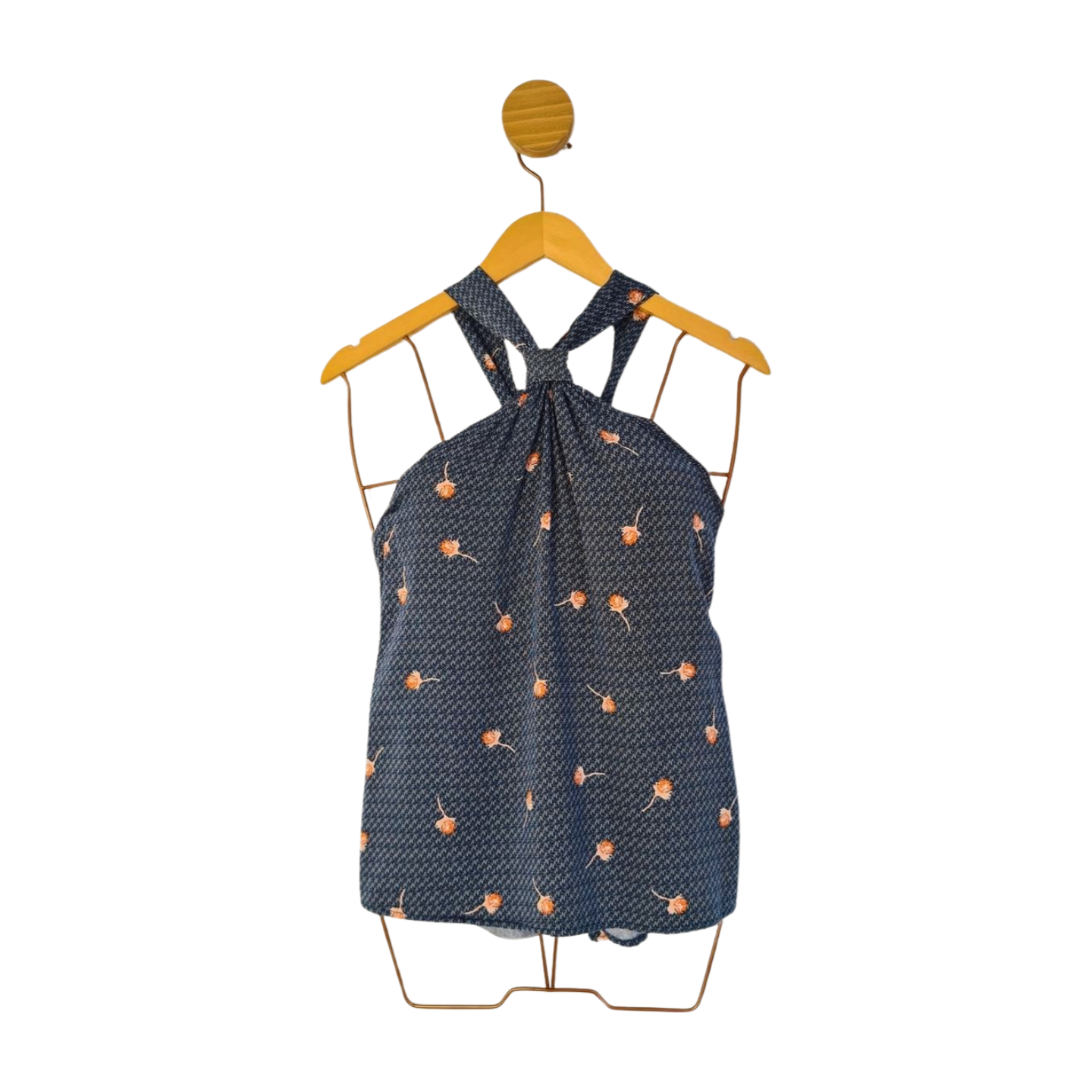 Blusa com detalhe de nó no decote, amarra nas costas. 100% Viscose. Medidas: 100 cm busto, 103 cm cintura, 64 cm comprimento.