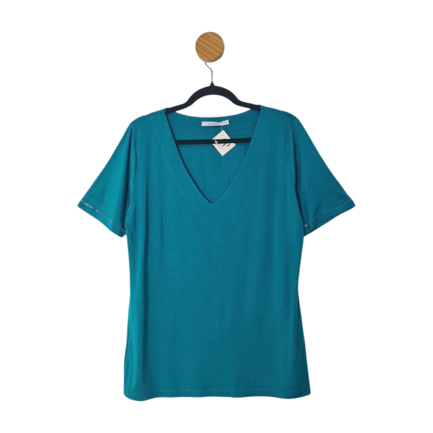 Blusa ampla em malha com hotfix na manga e decote V, 92% Viscose e 8% Elastano - Nova! Medidas: 106 cm busto, 106 cm cintura, 68 cm comprimento.