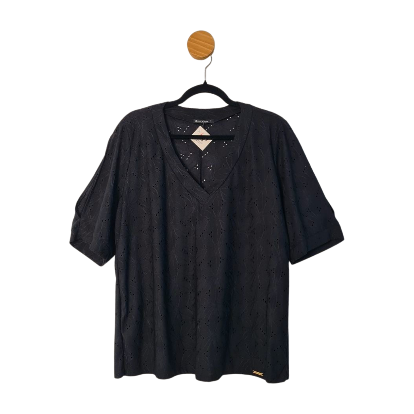 Blusa em malha detalhe de laise, forrado na frente, decote V, em Poliéster com Elastano. Medidas: 116 cm busto, 118 cm cintura, 66 cm comprimento.