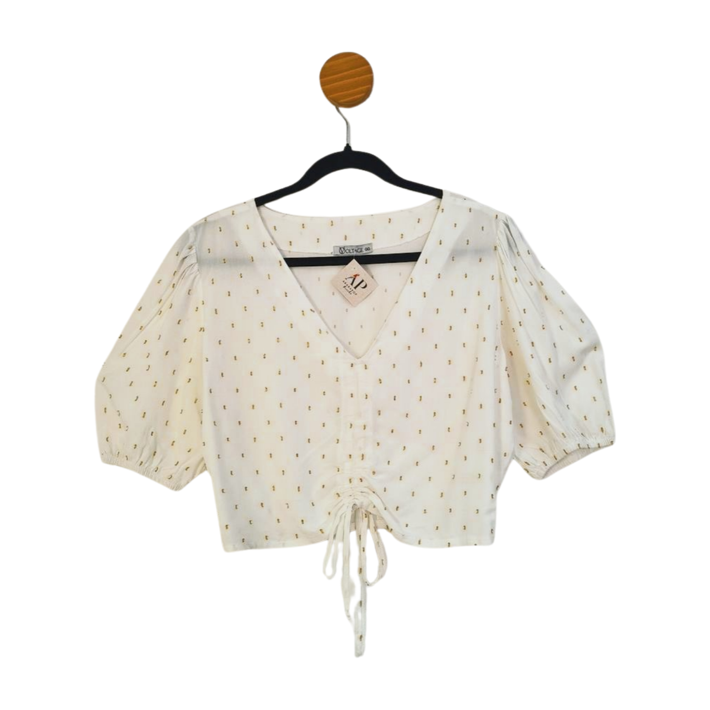 Blusa cropped ampla, em poá com fios metalizados, elástico atrás na barra, 100%Viscose. Medidas: 108 cm busto, 80/90 cm cintura, 44 cm comprimento.