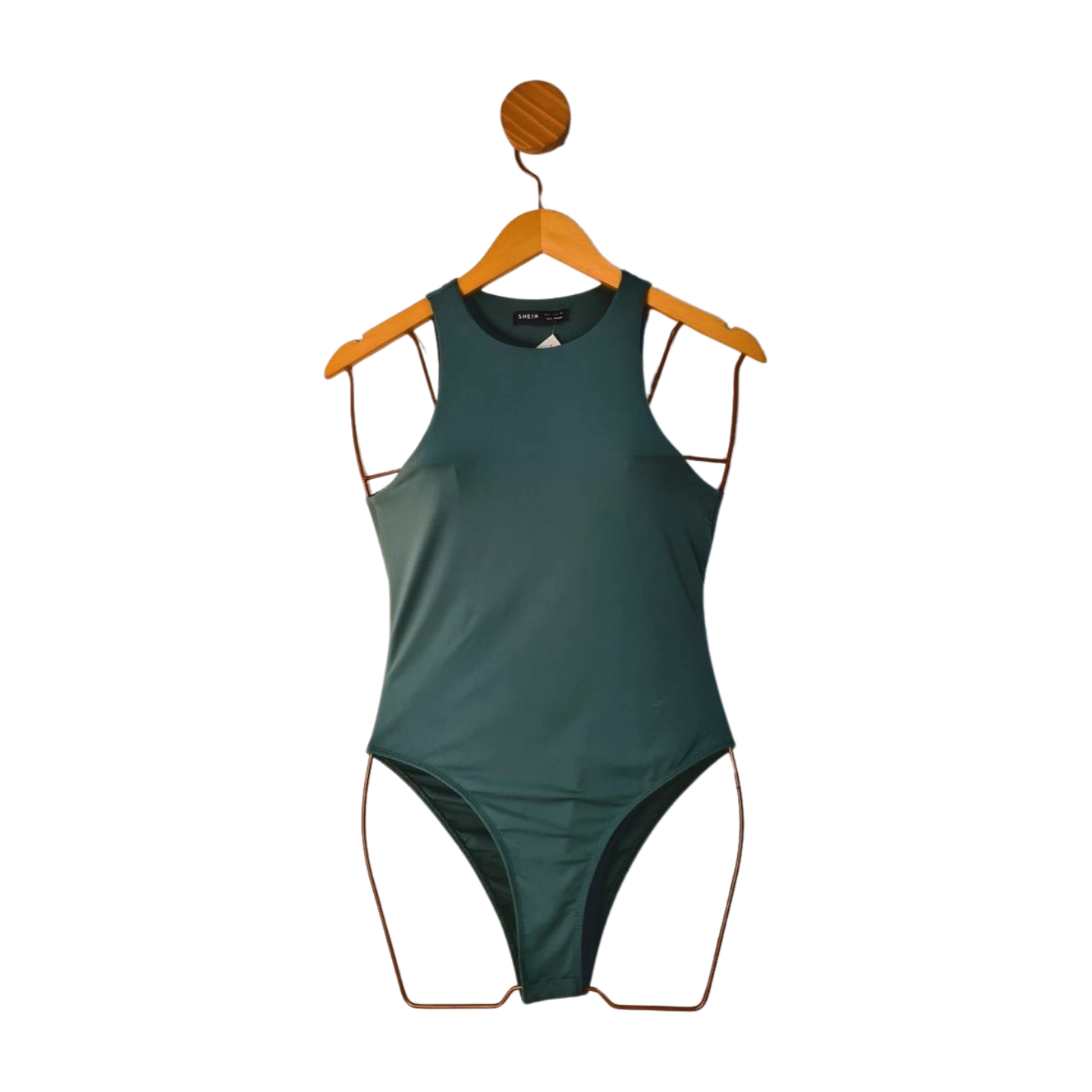 Body em malha com dupla camada de tecido, 87% Poliamida e 13% Spandex. Medidas: 80 cm busto, 74 cm cintura, 70 cm comprimento.