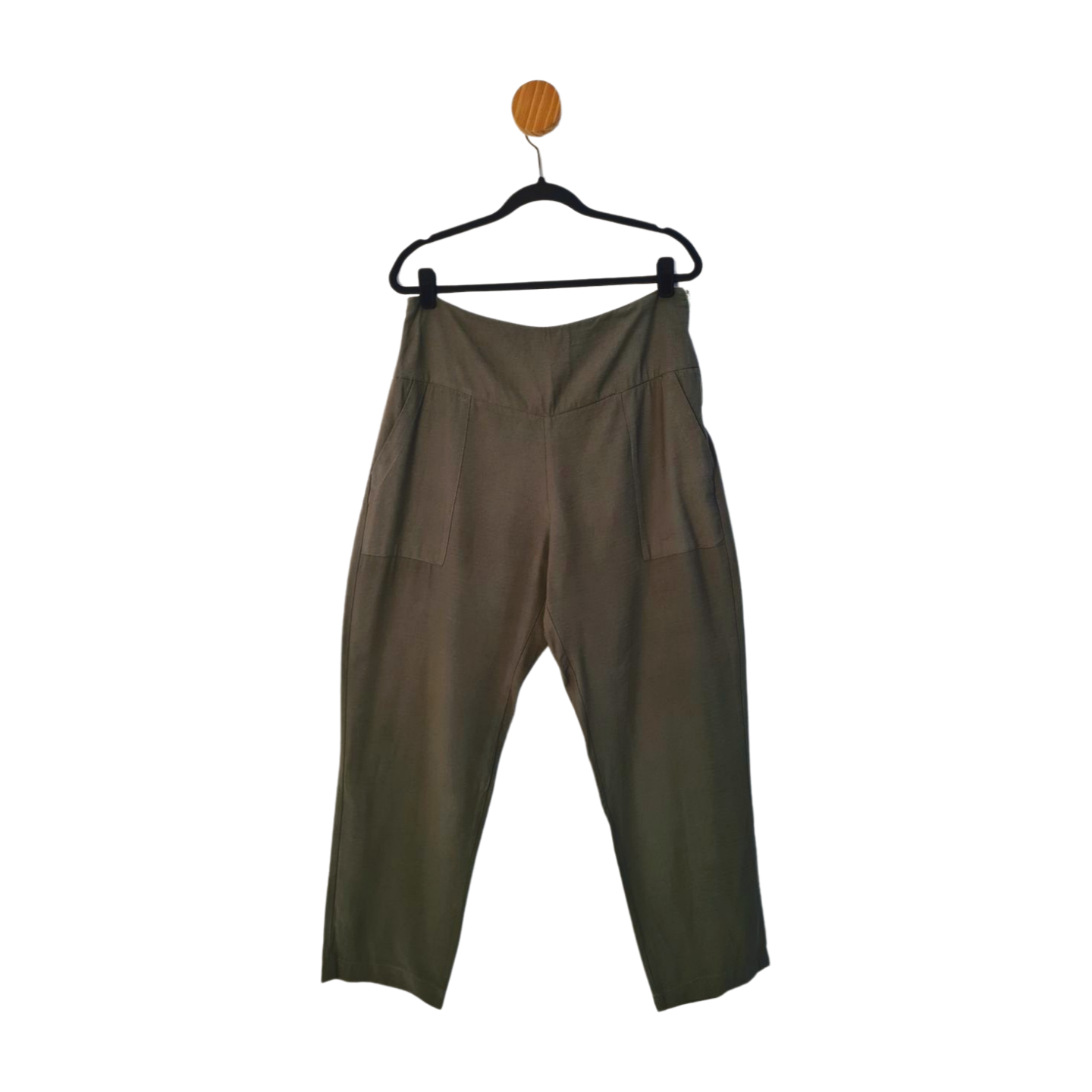 Calça alfaiataria em Viscose com bolso sobreposto e zíper tratorado na lateral. Medidas: 86 cm cintura, 122 cm quadril, 100 cm comprimento, 34 cm gancho.