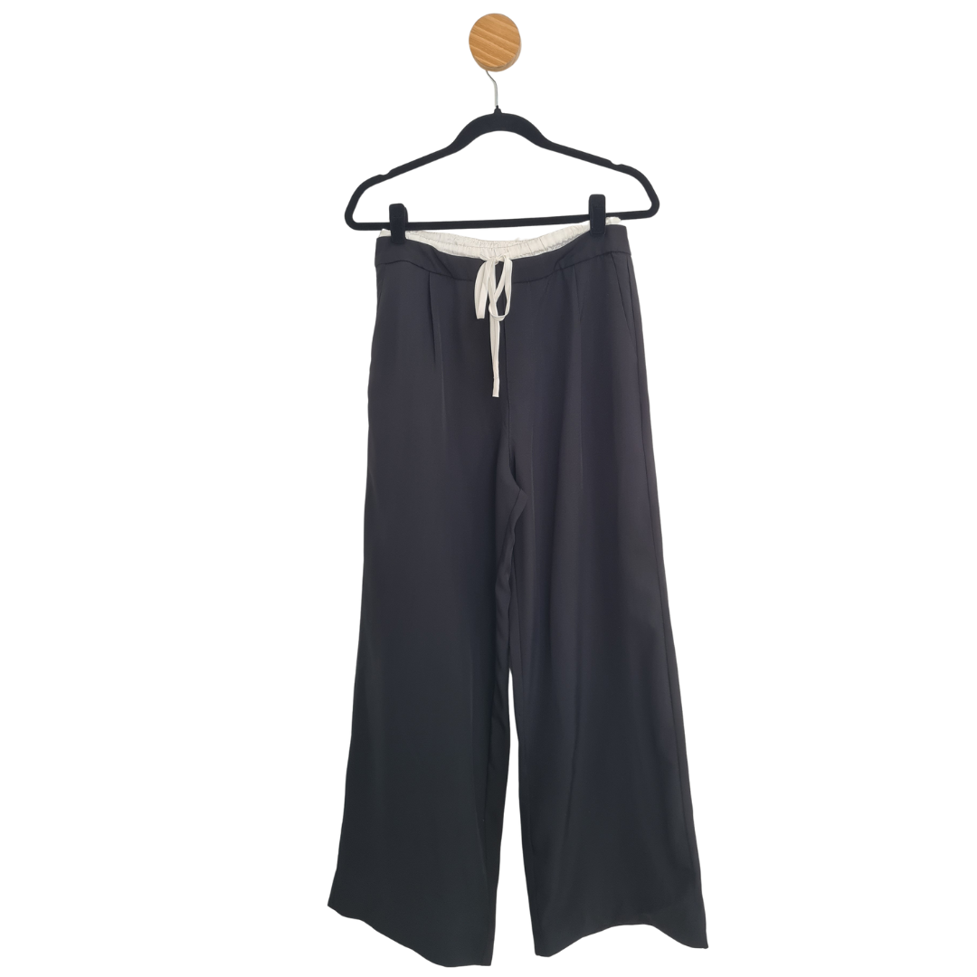 Calça pantalona com elástico, cordão e zíper para fechamento, bolsos, tecido leve e fluido. 97% Poliéster, 3% Elastano. Nova, com etiqueta! Medidas: 80 cm cintura, 110 cm quadril, 103 cm comprimento, 34 cm gancho.