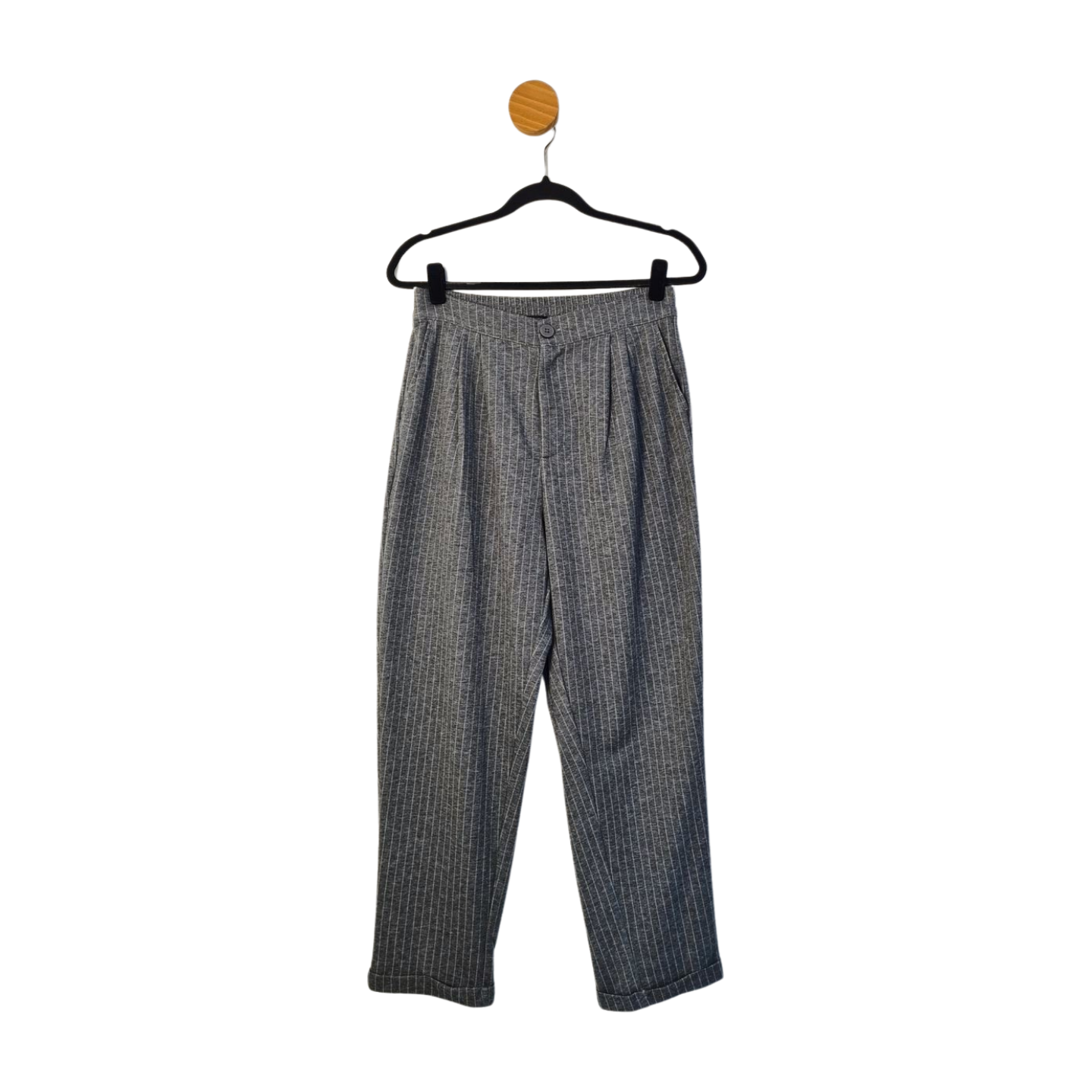 Calça listrada em malha encorpada com elástico no cós e bolsos. Medidas: 80/90 cm cintura, 128 cm quadril, 96 cm comprimento, 32 cm gancho.