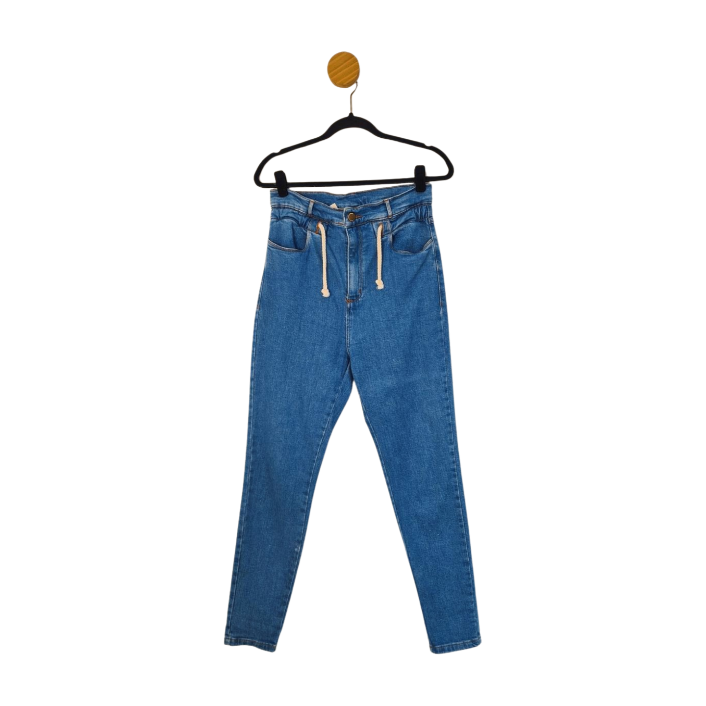 Calça jeans skinny, cintura super alta, com elasttico e cordão para ajuste na cintura,99% algodão, 1elastano Medidas: 80 cm cintura, 104 cm quadril, 105 cm comprimento, 32 cm gancho.