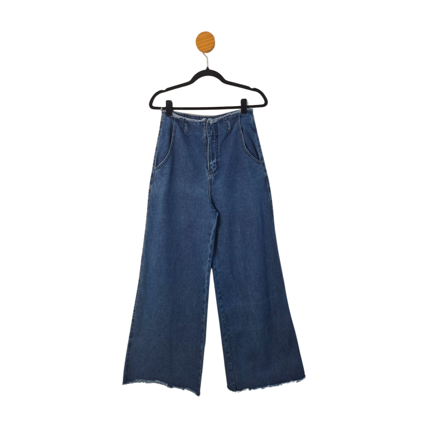Calça jeans pantalona, cintura super alta, com bolsos. 100% Algodão. Medidas: 74 cm cintura, 108 cm quadril, 104 cm comprimento, 33 cm gancho.