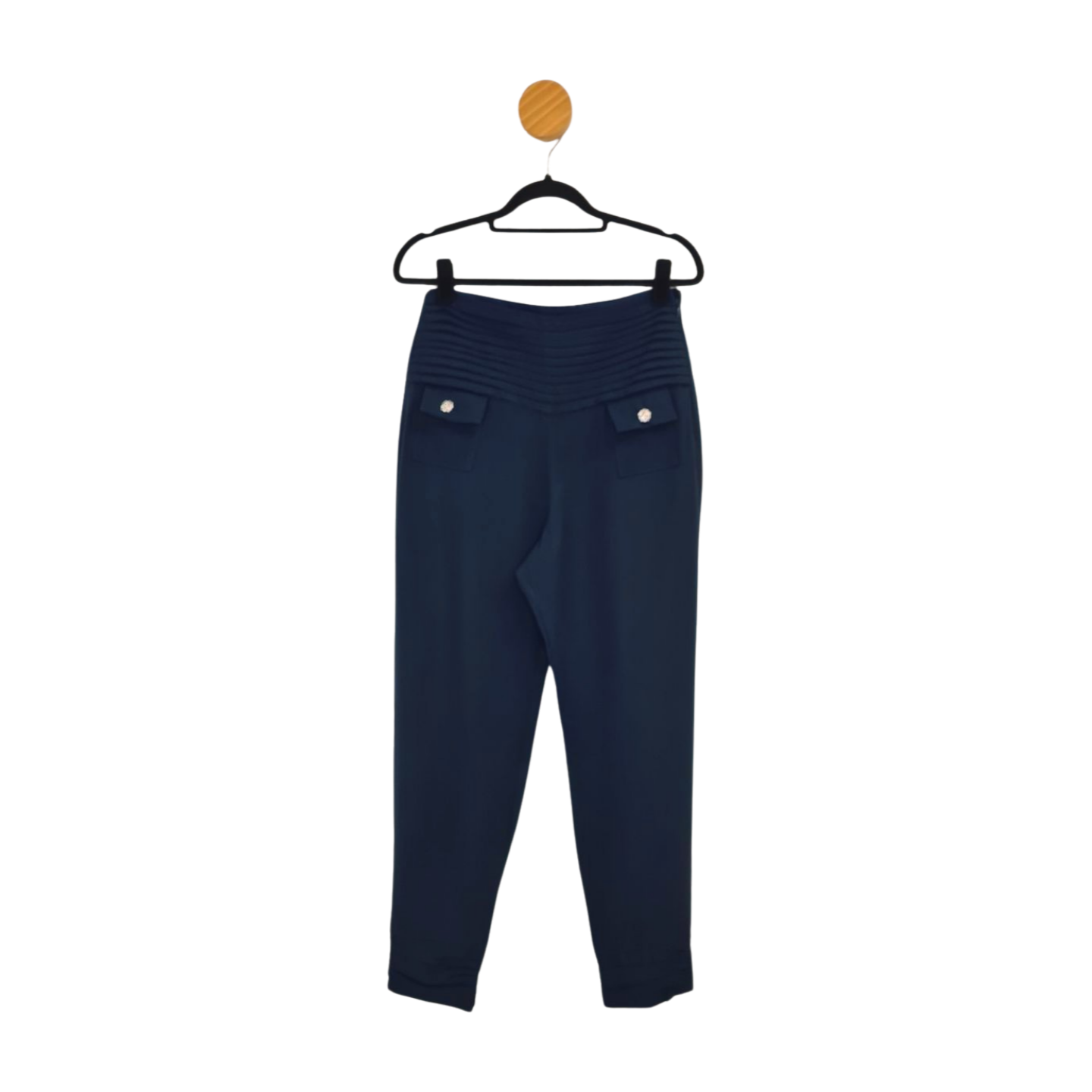 Calça clochard, cós alto, detalhe drapeado, solsos pequenos sobrepostos na frente, abre em zíper lateral. 71% Acetato, 29% Viscose. Medidas: 74 cm cintura, 100 cm quadril, 96 cm comprimento, 34 cm gancho.