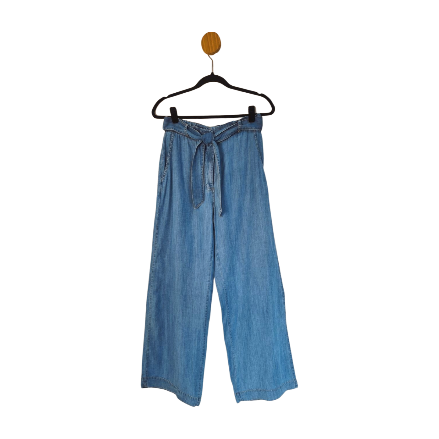 Calça pantalona em jeans molinho, cós em elástico atras, bolsos, faixa avulsa, 100%Liocel. Medidas: 80/84 cm cintura, 116 cm quadril, 111 cm comprimento, 33 cm gancho.