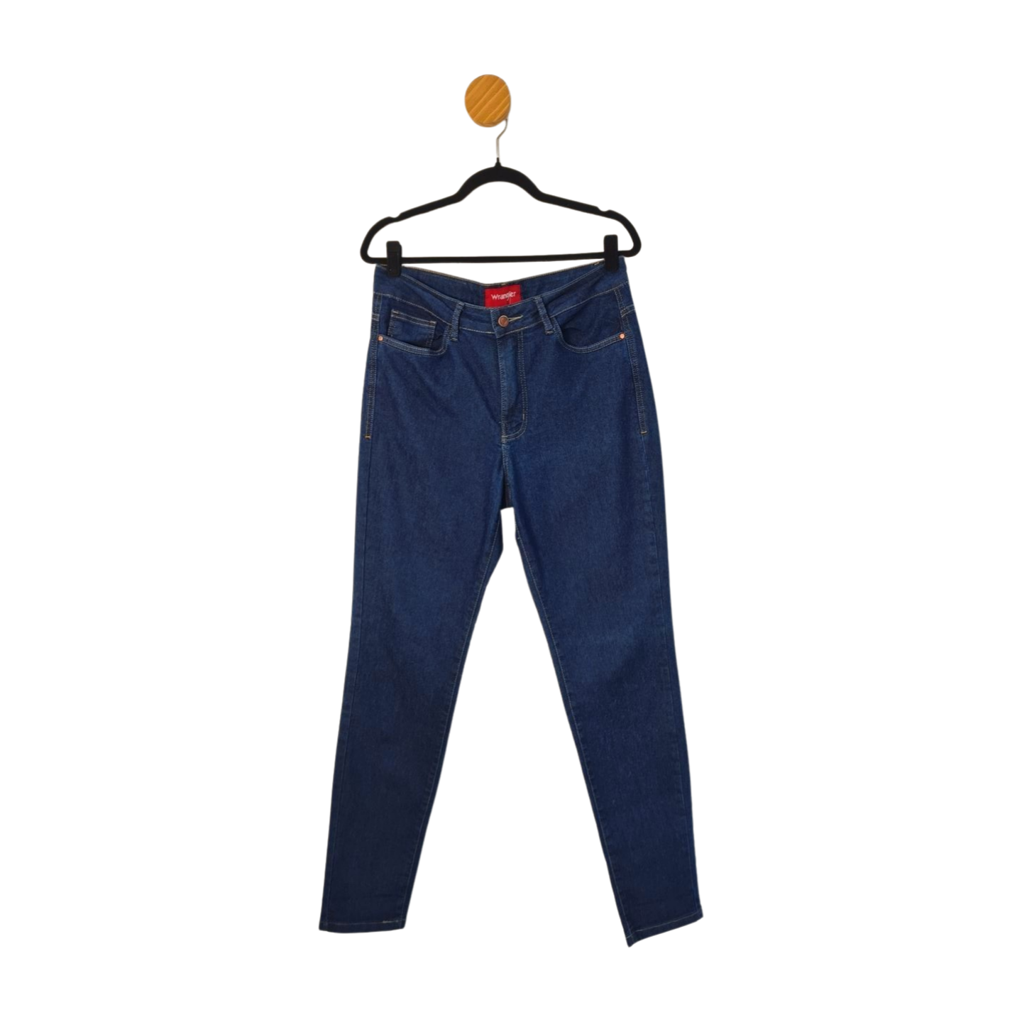 Calça jeans modelagem regular, cintura média alta. 82% Algodão, 16% Poliéster, 2% Elastano. Medidas: 88 cm cintura, 110 cm quadril, 108 cm comprimento, 26 cm gancho.