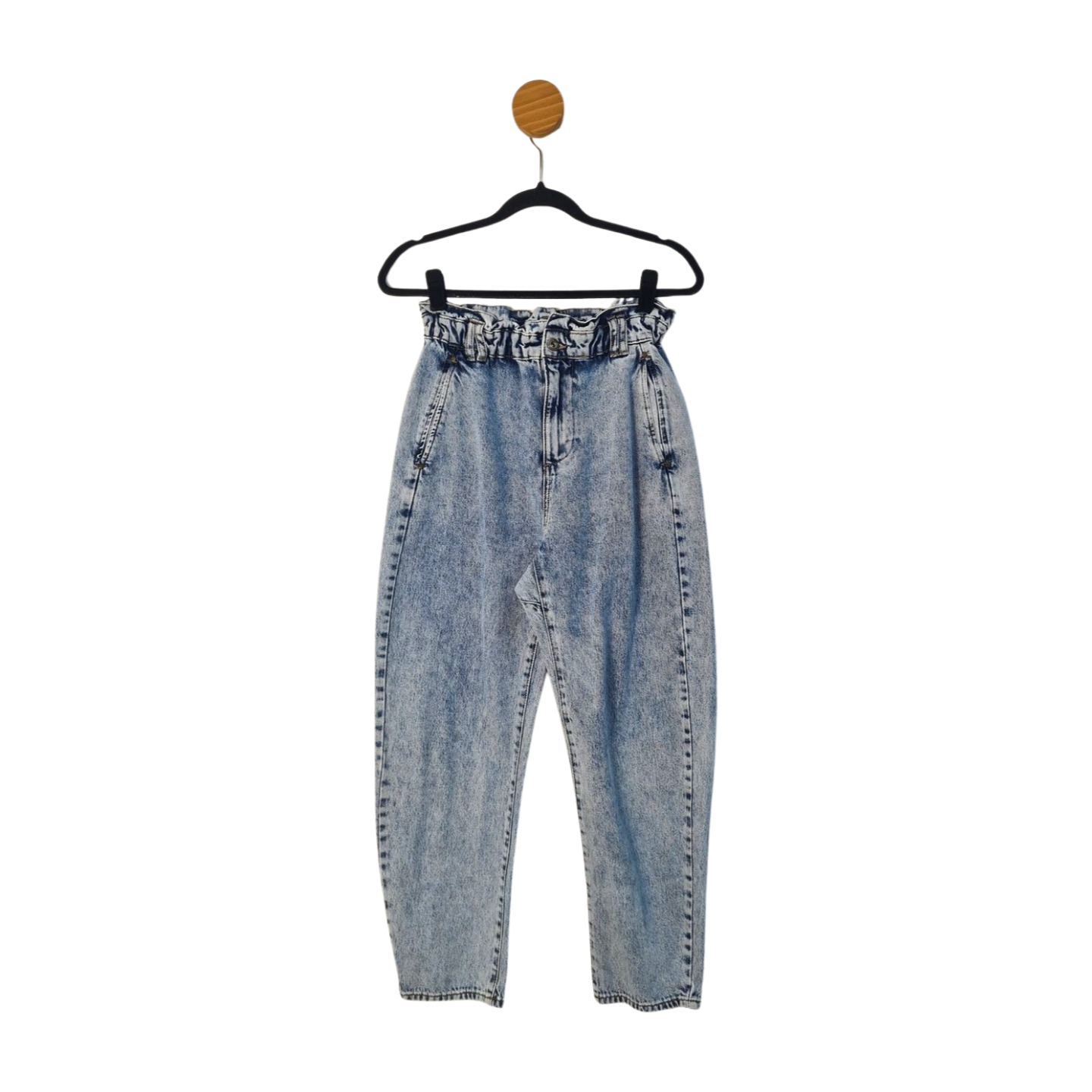 Calça jeans clochard com bolsos, elastico no cós, ampla no quadril, 100% algodão. Medidas: 76/82 cm cintura, 106 cm quadril, 96 cm comprimento, 32 cm gancho.