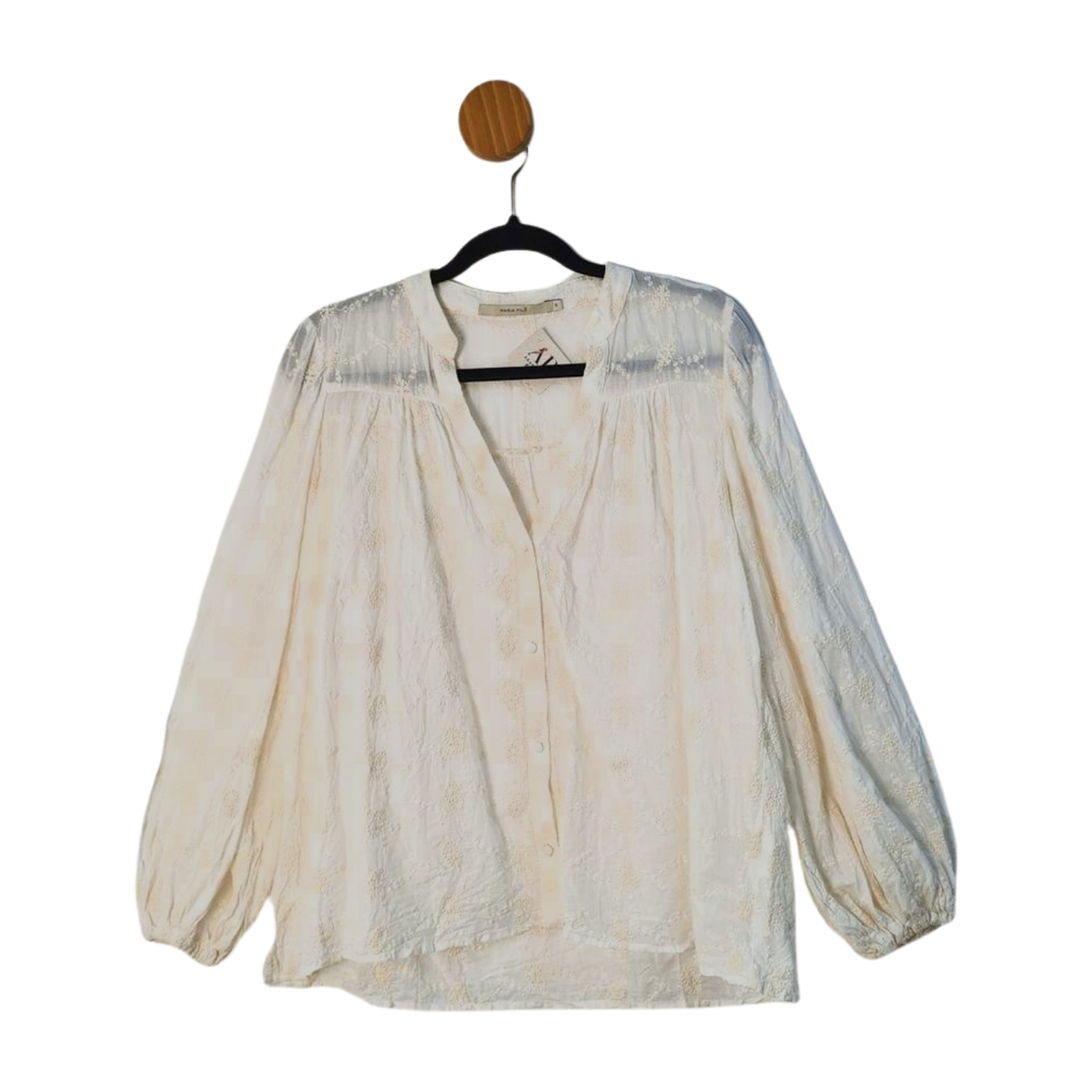 Camisa bordada, botões revestidos, punho em elástico, 100% Algodão. Medidas: 120 cm busto, 126 cm cintura, 64 cm comprimento.