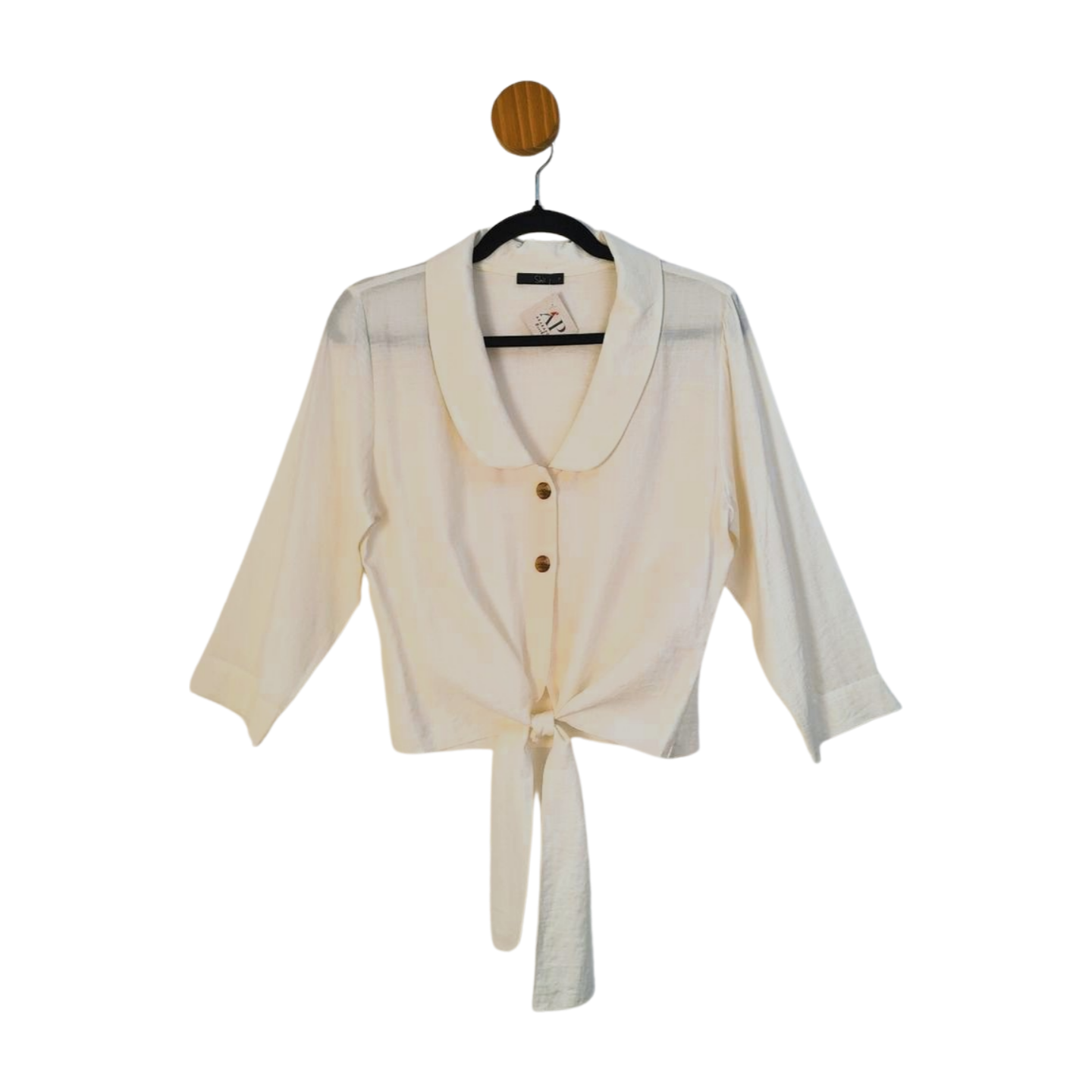 Camisa gola com amarração, 55% Viscose e 45% Poliéster. Medidas: 94 cm busto, 92 cm cintura, 50 cm comprimento.