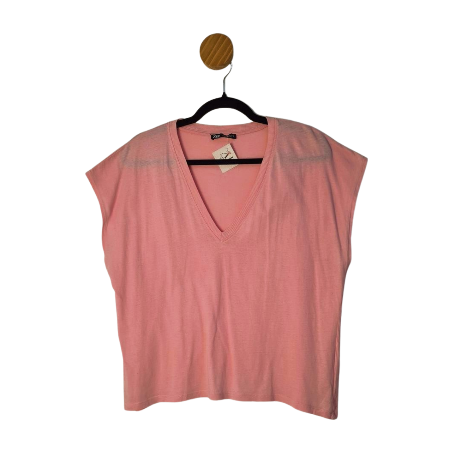 Camiseta gola V. Medidas: 110 cm busto, 110 cm cintura, 58 cm comprimento.
