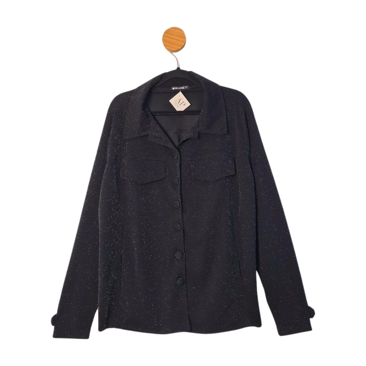 Casaco em malha fios metalizados, com bolsos e botões revestidos, 95% Poliéster e 5% Elastano. Medidas: 120 cm busto, 120 cm cintura, 68 cm comprimento.