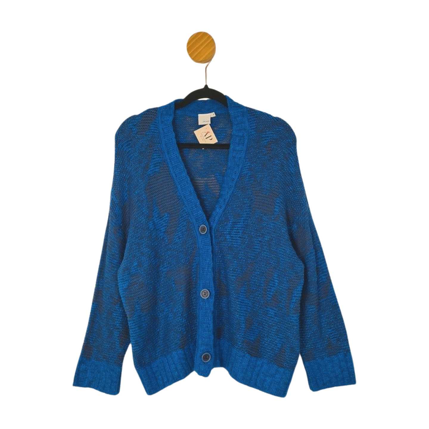 Casaco em tricot mesclado, fechamento em botões, barra e gola em trama canelada. 68% Acrílico, 25% Algodão, 5% Poliamida, 2% Viscose. Medidas: 120 cm busto, 130 cm cintura, 65 cm comprimento.