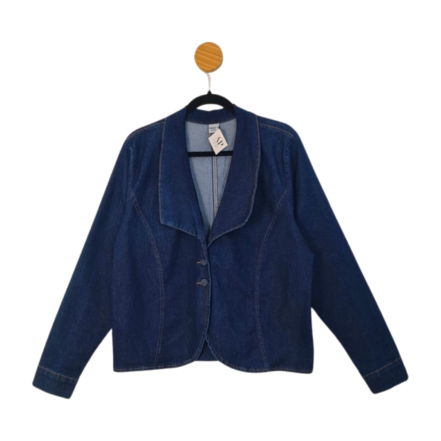 Jaqueta jeans com costuras anatômicas, lapela e fechamento em botões revestidos, 78,5% Algodão, 20% Poliéster e 1,5% Elastano. Medidas: 126 cm busto, 124 cm cintura, 60 cm comprimento.