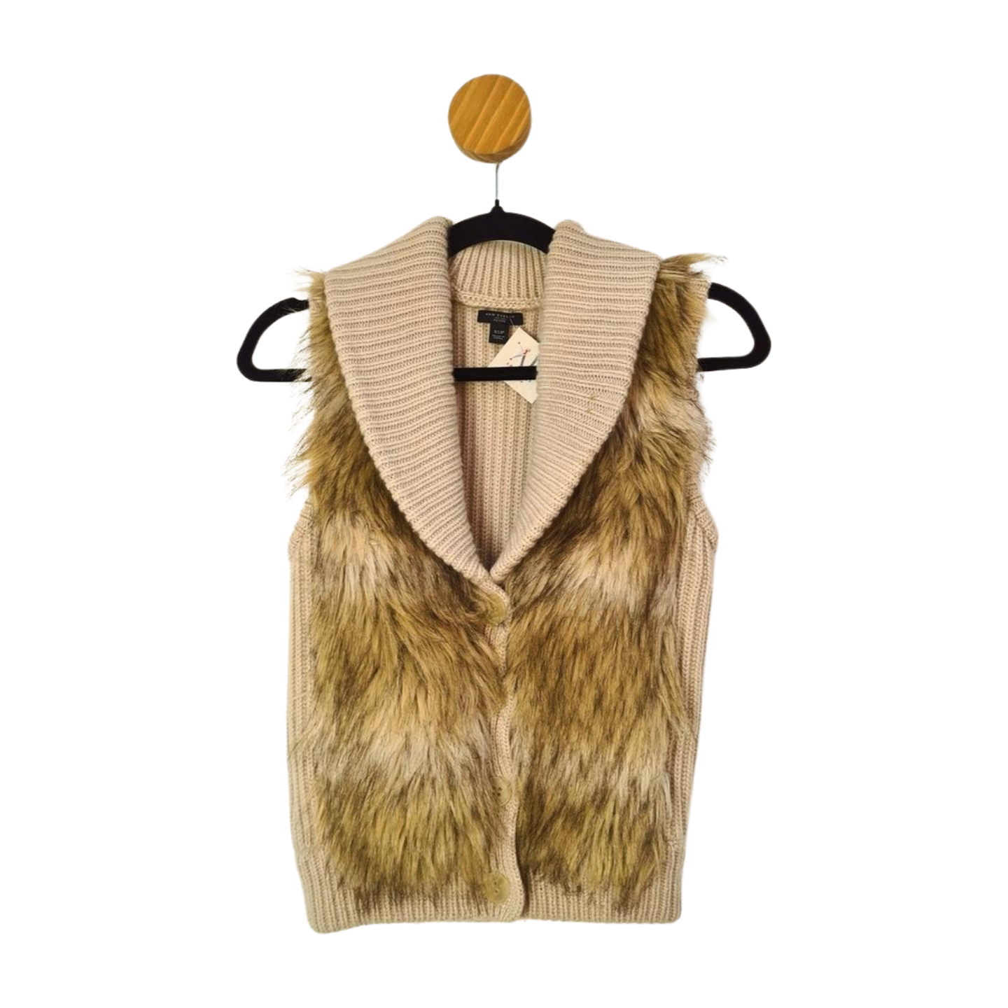 Colete em tricot, gola xale, com aplicação de pelos na frente Medidas: 82 cm busto, 80 cm cintura, 50 cm comprimento.