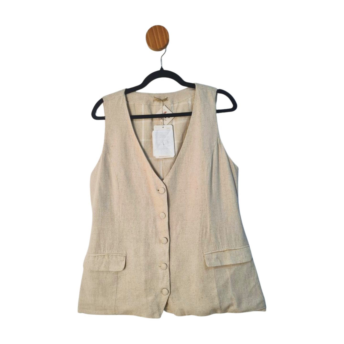 Colete em alfaiataria, botões revestidos, todo forrado, 70% Viscose e 30%Linho - Novo, com etiqueta! Modelo Betina. Medidas: 104 cm busto, 100 cm cintura, 66 cm comprimento.