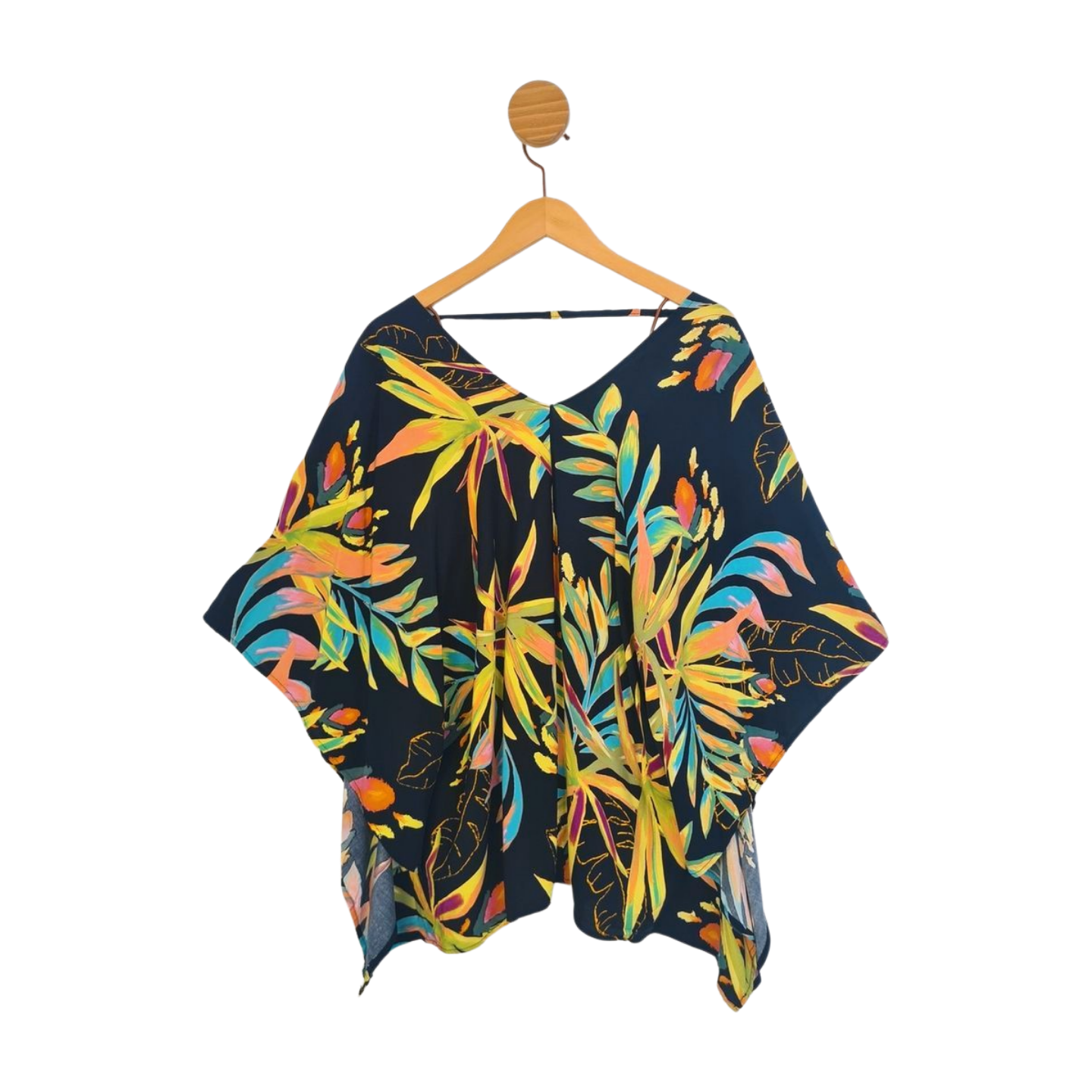 Kimono folhagens, em Viscose. Medidas: 2 m largura, 65 cm altura.