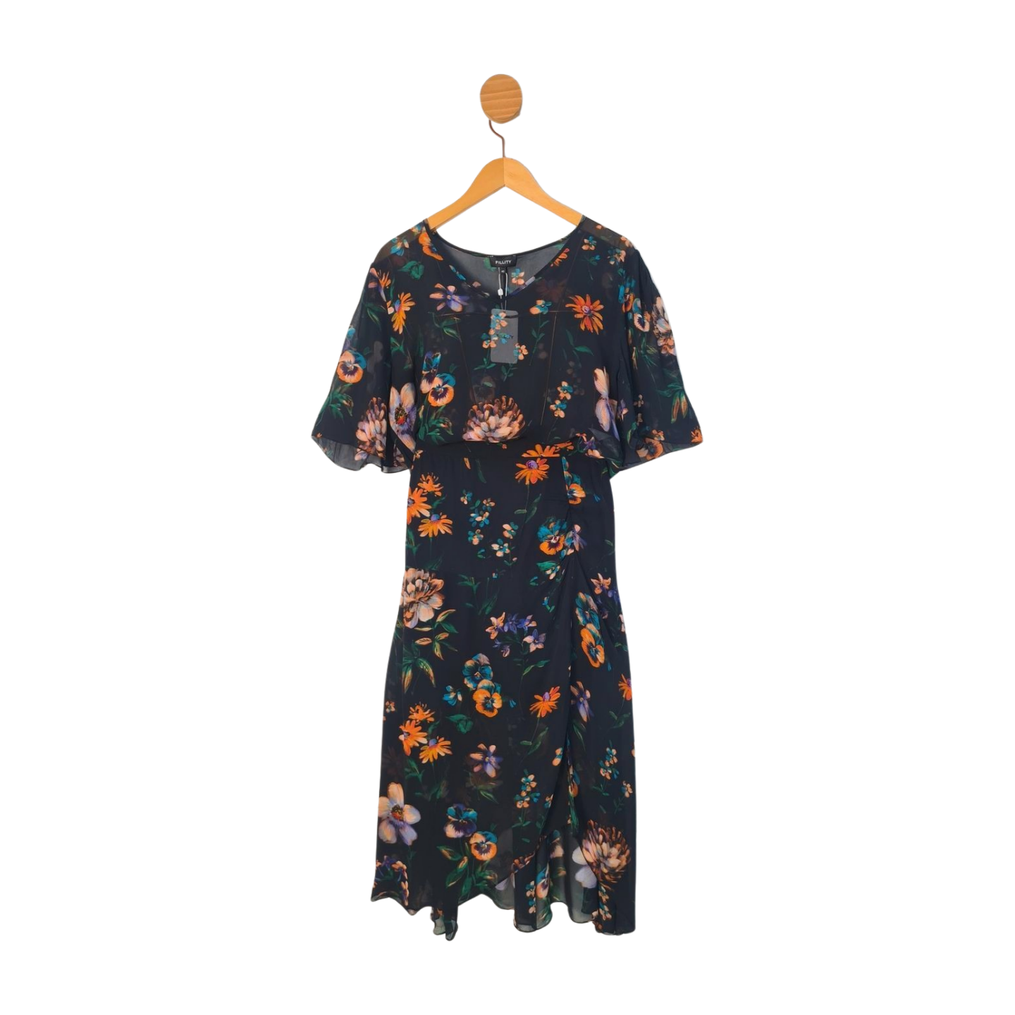 Conjunto em crepe, saia midi forrada, fecha em zíper e blusa ampla com transparência, 100% Viscose - Novo com etiqueta!