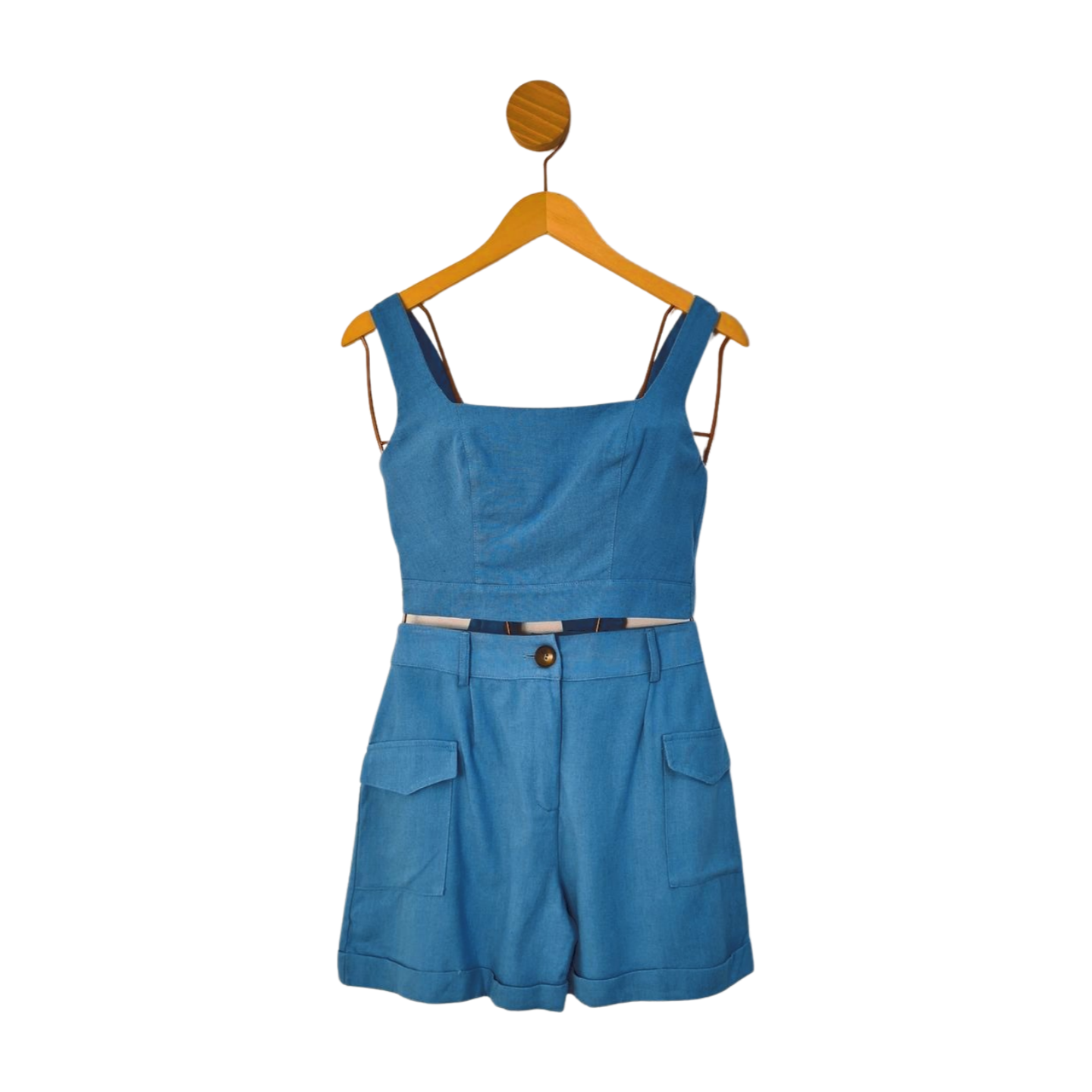 Conjunto de linho de top com amarração e short cargo, com passantes e barra italiana, 40%Viscose, 32%Poliester, 18%Linho, 5%Algodão e 5%Poliamida. Medidas blusa: 90 cm busto, 74 cm cintura, 38 cm comprimento. Medidas short: 74 cm cintura, 104 cm quadril, 39 cm comprimento, 30 cm gancho.