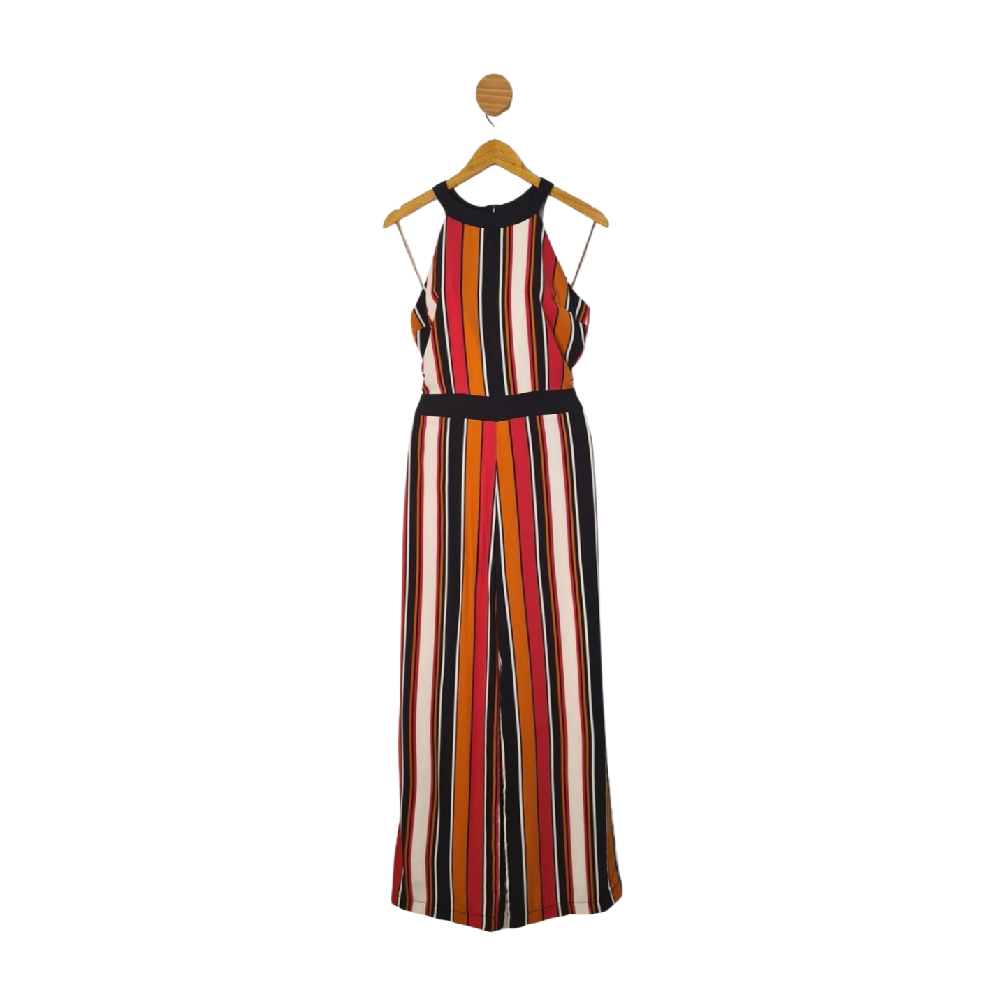 Macacão listrado, acinturado, forrado, fechamento em zíper invisível atrás. Medidas: 88 cm busto, 70 cm cintura, 98 cm quadril, 152 cm comprimento.