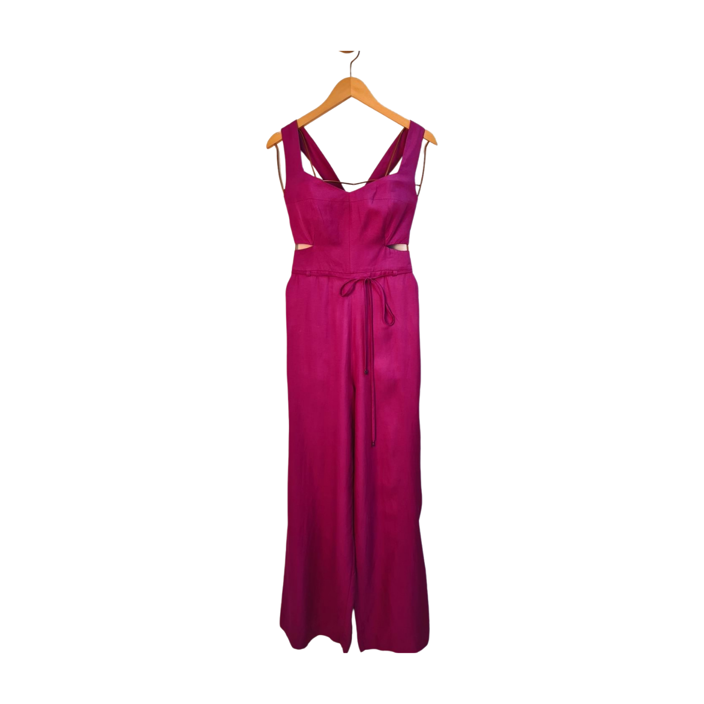 Macacão longo com detalhe vazado na cintura alta, tem cordão para acinturar, fecha em ziper nas costas, tem bolsos, tecido macio e fluido 81%viscose, 19% linho - Novo!