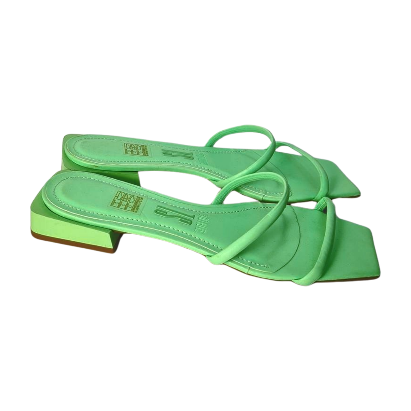 Rasteira bico e salto quadrados. Medidas: 26 cm solado, 2 cm salto.