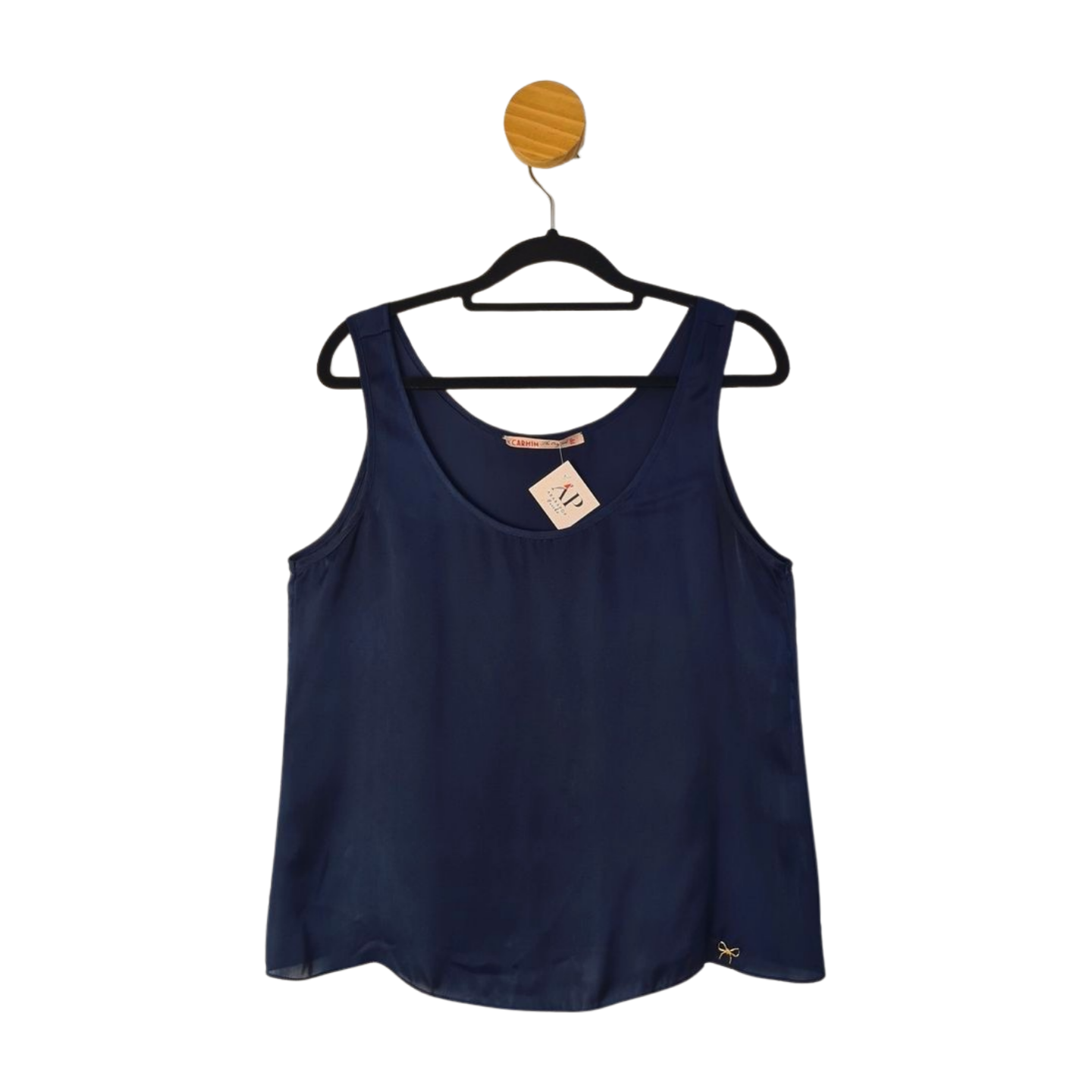Regata em tecido leve e fluido com leve transparência, 100% Poliéster. Medidas: 92 cm busto, 92 cm cintura, 56 cm comprimento.