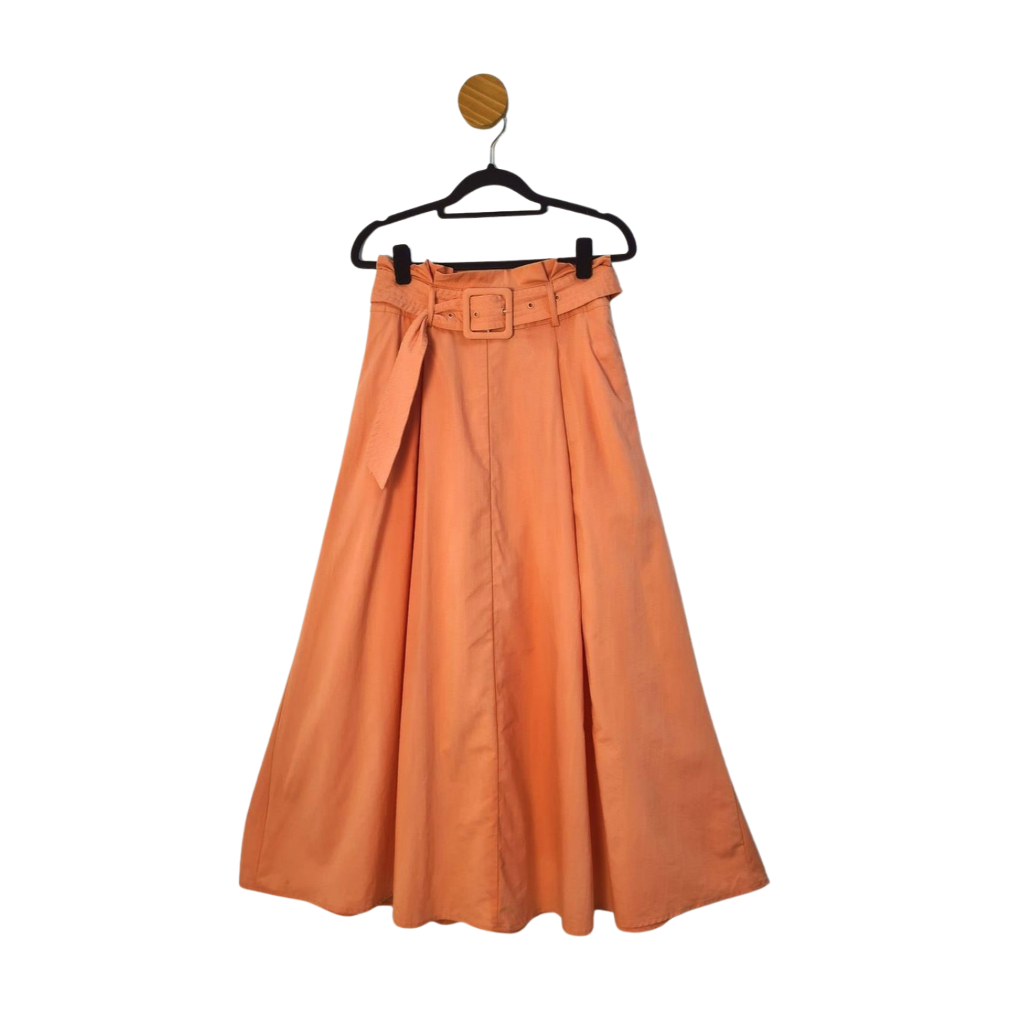 Saia longa evase, com bolsos, cós alto, passantes e cinto faixa no mesmo tecido com fivela revestida, fecha em zíper lateral, 51% Viscose, 38% Poliester e 11% Poliamida. Medidas: 70 cm cintura, 144 cm quadril, 93 cm comprimento.