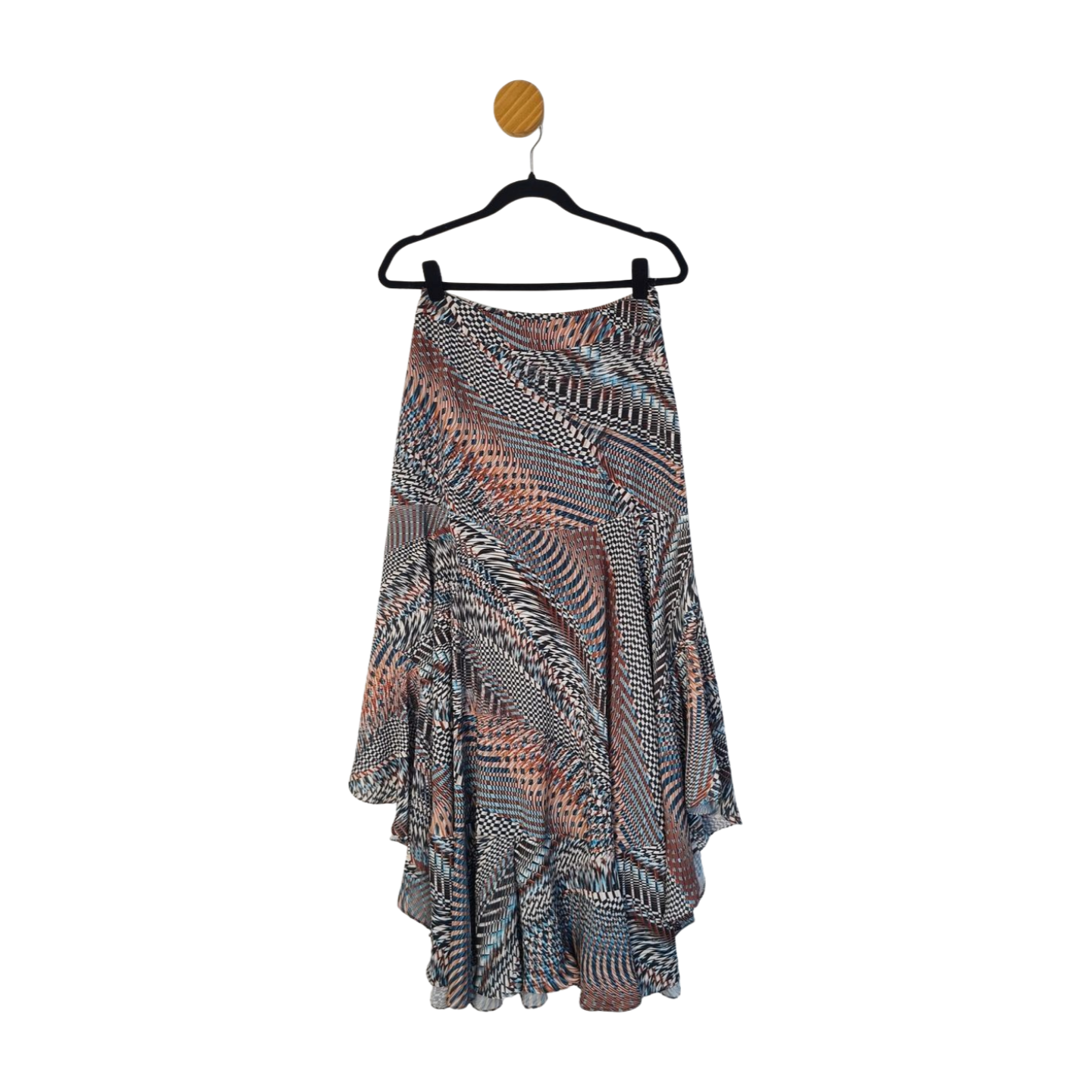 Saia longa em crepe estampa geométrica, barra em U, forrada no quadril, fecha em zíper lateral. 100% Poliéster. Medidas: 76 cm cintura, 98 cm quadril, 100 cm comprimento.