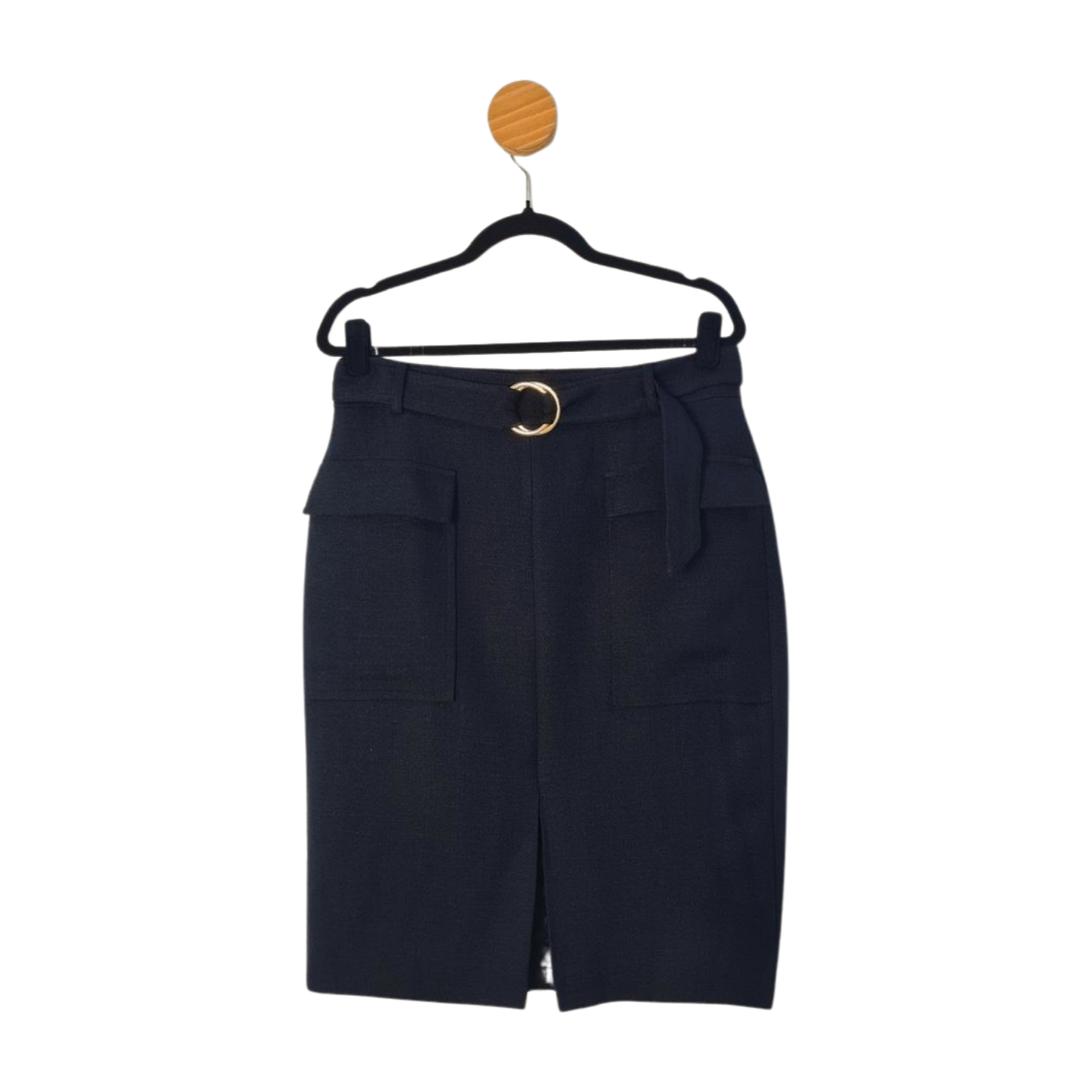 Saia lápis em crepe texturizado e encorpado, forrada em cetim, com bolso sobreposto na frente, cinto faixa, fecha em zíper atrás. 100% Poliéster. Medidas: 80 cm cintura, 104 cm quadril, 62 cm comprimento.