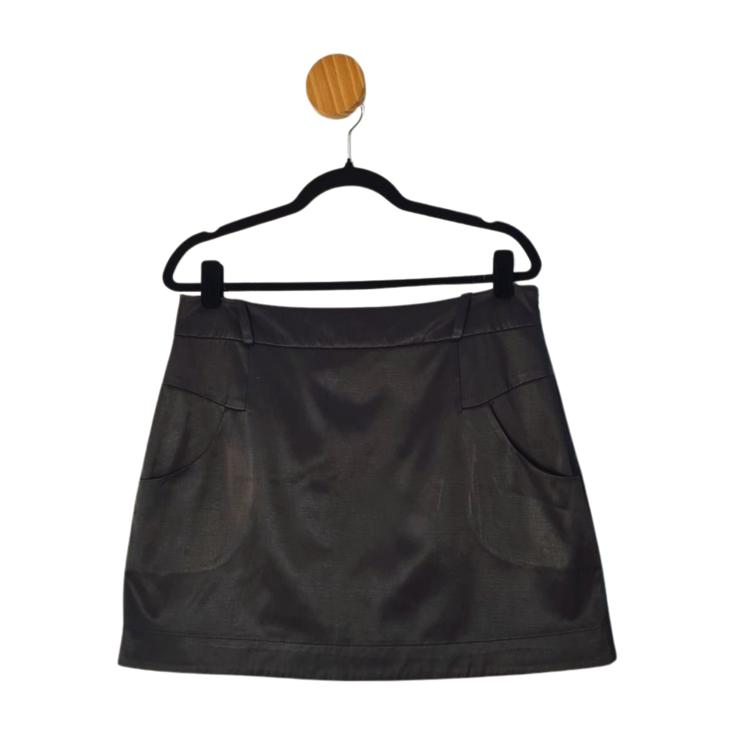 Saia com bolsos, zíper lateral. Tecido encorpado acetinado. Medidas: 86 cm cintura, 108 cm quadril, 42 cm comprimento.