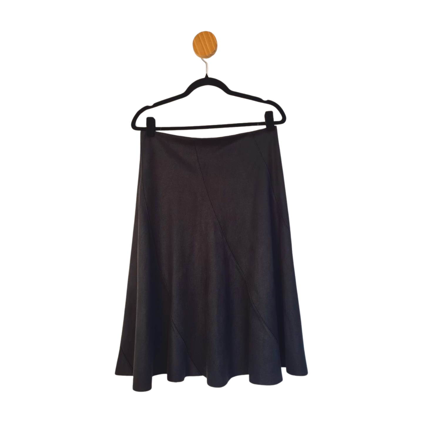 Saia evasê em suede encorpado, fechamento e, zíper tratorado atrás. Medidas: 86 cm cintura, 118 cm quadril, 68 cm comprimento.