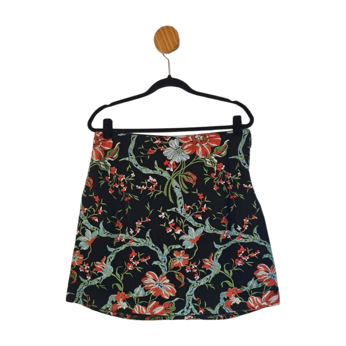 Saia em tule com bordado floral, toda forrada em crepe, fechemento em zíper lateral. Medidas: 82 cm cintura, 110 cm quadril, 48 cm comprimento.