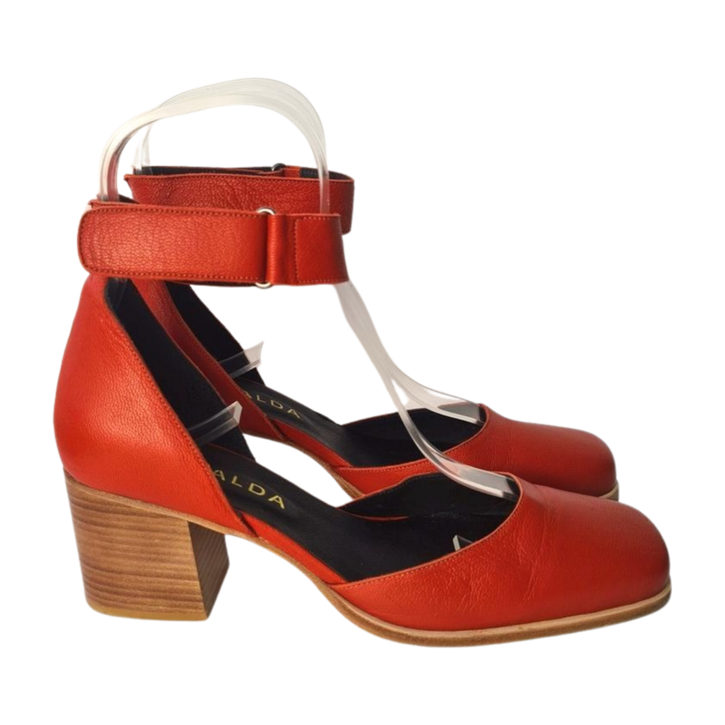 Sandália LOUISE em couro com bico quadrado, salto bloco em madeira natural, tira no tornozelo com fechamento em velcro, tem forro e sola em couro com capa emborrachada. As criações da Mafalda Sapatos são feitas à mão, com matéria prima nacional e design exclusivo. Medidas: 6 cm solado, 27 cm salto.