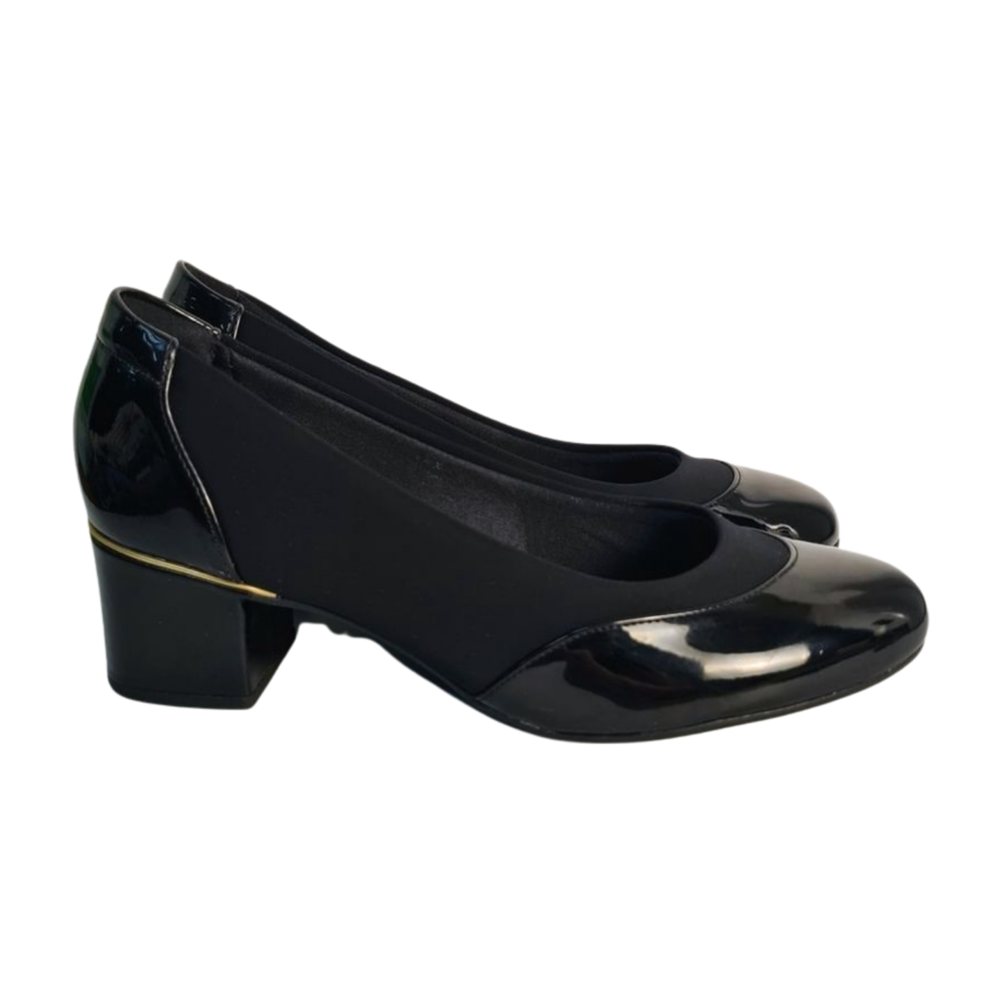 Scarpin em verniz, ultra conforto, bico arredondado, salto bloco, solado emborrachado. Medidas: 25 cm solado, 5 cm salto.