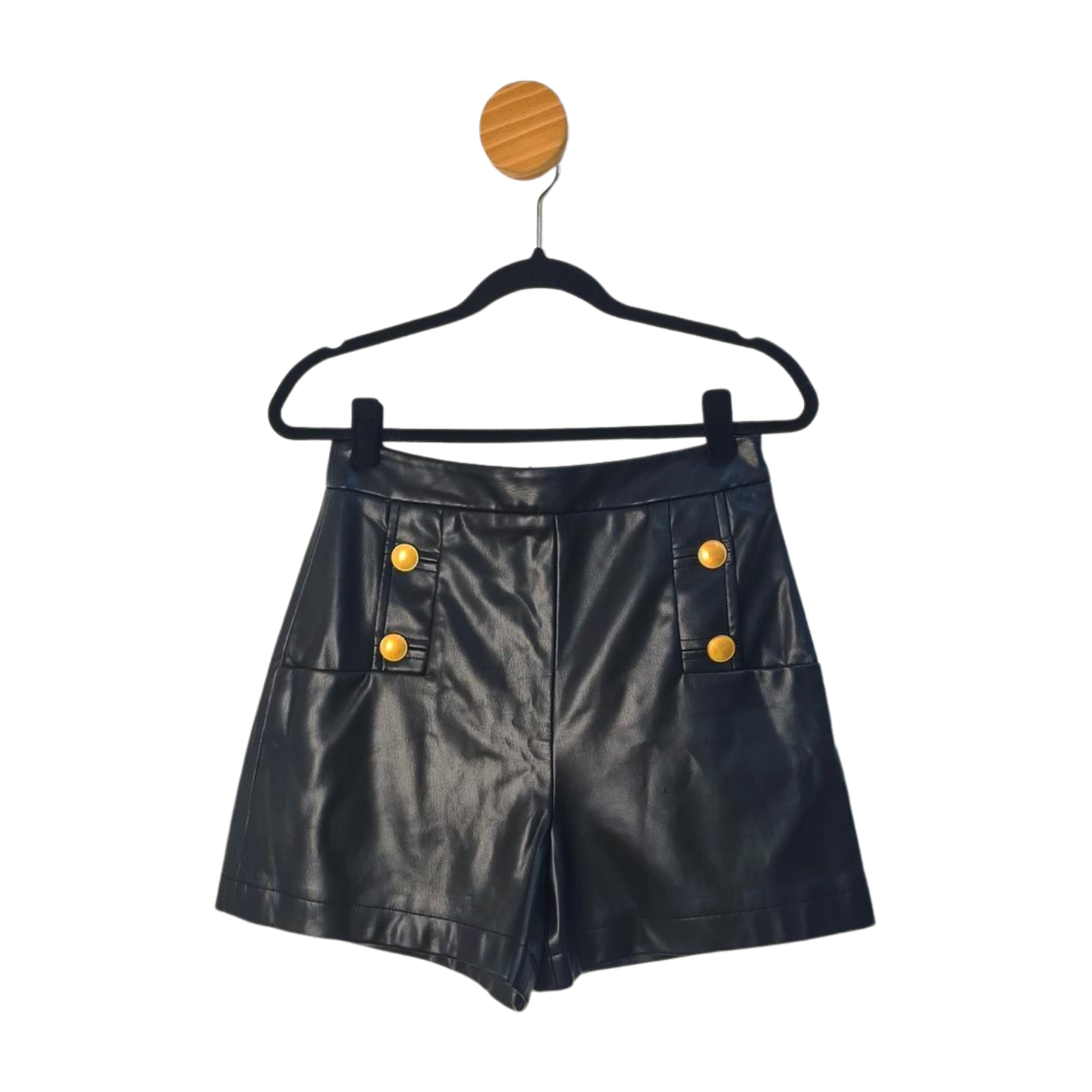 Short em material sintético, cintura alta, bolsos, botões não funcionais, fechamento atrás em zíper invisivel, revestimento aveludado por dentro Medidas: 74 cm cintura, 102 cm quadril, 40 cm comprimento, 32 cm gancho.