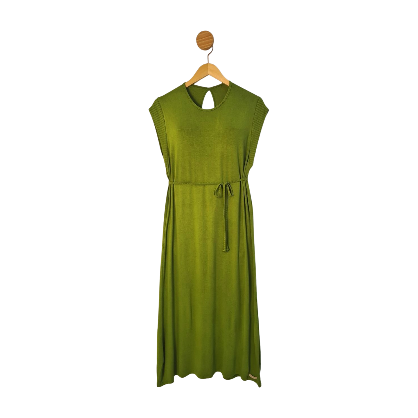 Vestido midi, reto, em malha super macia, manga muscle-T, acompanha cordão para acinturar. Medidas: 120 cm busto, 120 cm cintura, 130 cm quadril, 117 cm comprimento.
