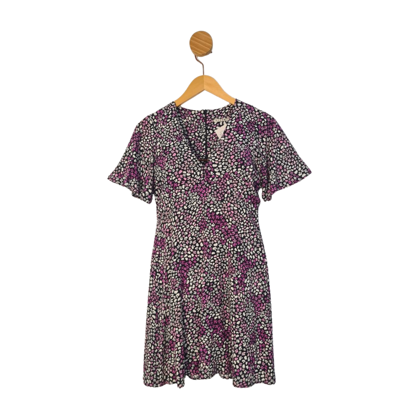 Vestido florido acinturado, com decote V e fechamento em zíper invisível, tecido leve e flúido, 100% Viscose. Medidas: 82 cm busto, 74 cm cintura, 104 cm quadril, 86 cm comprimento.