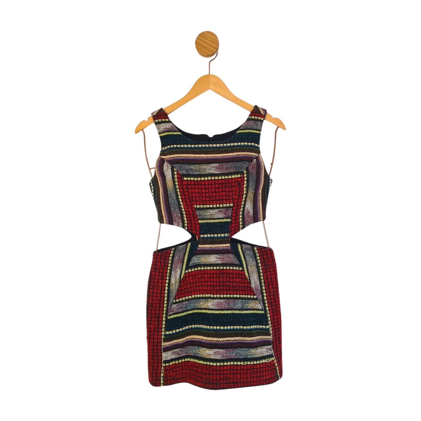 Vestido ajustado ao quadril, com detalhe vazado na cintura, fecha em zíper atras, tecido super encorpado e texturizado, 90% Algodão e 10% Poliéster Medidas: 72 cm busto, 70 cm cintura, 90 cm quadril, 80 cm comprimento.